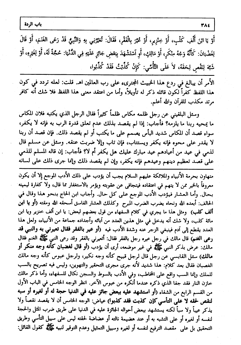 أو يا ابن ألف كلب، أو خنزير أو عير بالفقر فقال: تعيرني به والنبي قد رعى الغنم أو قال لغضبان: كأنه وجه منكر أو مالك أو استشهد ببعض جائر عليه في الدنيا حجة له، أو لغيره، أو شبه لنقص لحقه لا على التاسي، كإن كذبت فقد كذبوا،