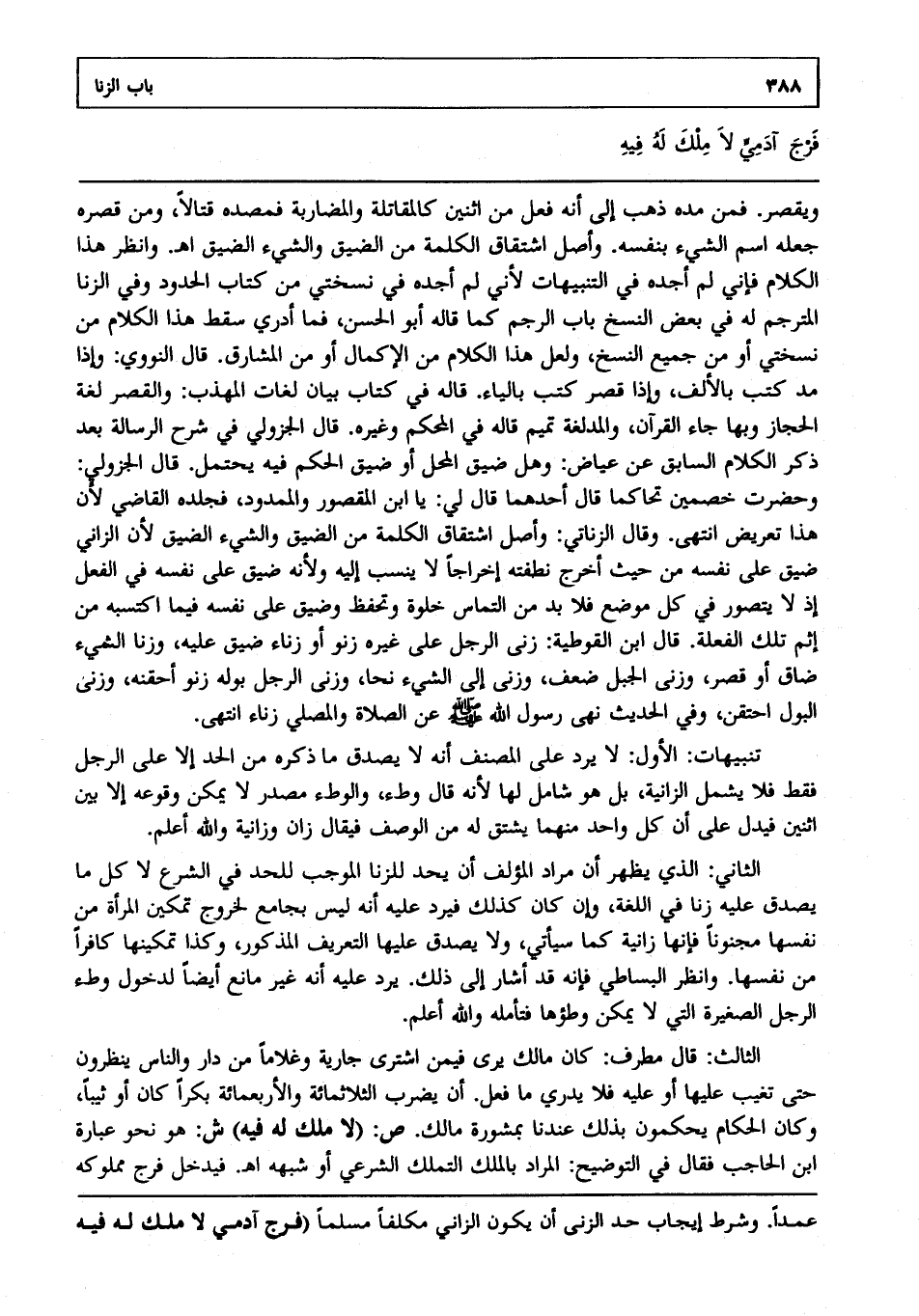 ويقصر فمن مده ذهب إلى أنه فعل من اثنين كالمقاتلة والمضاربة فمصدره قتالا ومن قصره جعله اسم الشيء بنفسه. وأصل اشتقاق الكلمة من الضيق والشيء الضيق ا هـ. وانظر هذا الكلام فإني لم أجده في التنبيهات؛ لأني لم أجده في نسختي من كتاب الحدود وفي الزنا المترجم له في بعض النسخ باب الرجم كما قاله أبو الحسن فما أدري سقط هذا الكلام من نسختي أو من جميع النسخ ولعل هذا الكلام من الإكمال أو من المشارق. قال النووي: وإذا مد كتب بالألف وإذا قصر كتب بالياء قاله في كتاب بيان لغات المهذب. والقصر لغة الحجاز وبها جاء القرآن والمد لغة تميم قاله في المحكم وغيره قال الجزولي في شرح الرسالة بعد ذكر الكلام السابق عن عياض وهل ضيق المحل أو ضيق الحكم فيه يحتمل؟ قال الجزولي: وحضرت خصمين تحاكما قال أحدهما: قال لي: يا ابن المقصور والممدود فجلده القاضي لأن هذا تعريض انتهى. وقال الزناتي: وأصل اشتقاق الكلمة من الضيق والشيء الضيق؛ لأن الزاني ضيق على نفسه من حيث أخرج نطفته إخراجا لا ينسب إليه ولأنه ضيق على نفسه في الفصل إذ لا يتصور في كل موضع فلا بد من التماس خلوة وتحفظ وضيق على نفسه فيما اكتسبه من إثم تلك الفعلة. قال ابن القوطية: زنى الرجل على غيره زنوا أو زناء ضيق عليه وزنا الشيء ضاق أو قصر وزنى الجبل ضعف وزنى إلى الشيء نحا وزنى الرجل بوله زنوا أحقنه وزنى البول احتقن. وفي الحديث: "نهى رسول الله صلى الله عليه وسلم عن الصلاة والمصلي زناء" انتهى.