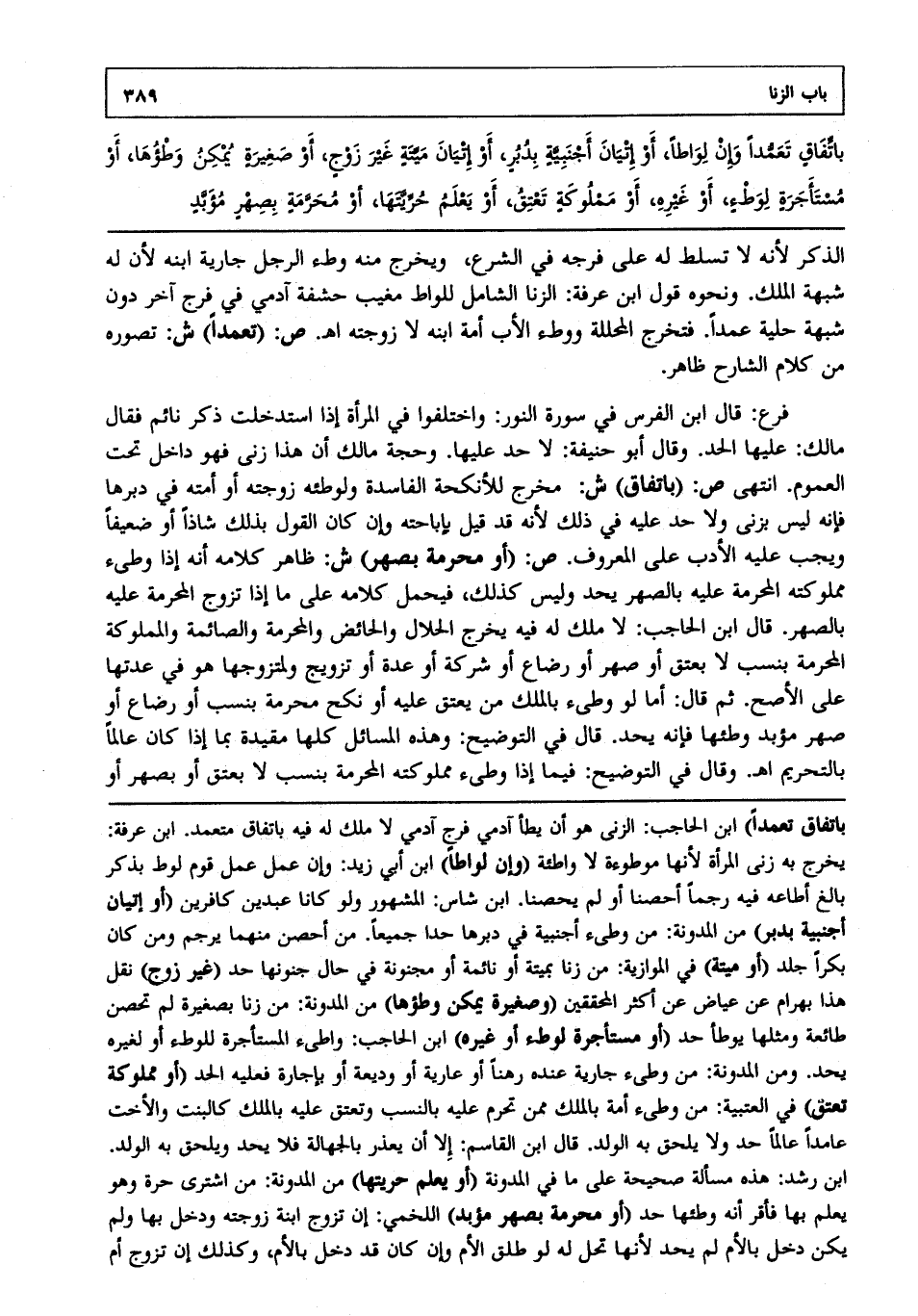 فرع: قال ابن الفرس في سورة النور: واختلفوا في المرأة إذا استدخلت ذكر نائم فقال مالك: عليها الحد. وقال أبو حنيفة: لا حد عليها. وحجة مالك أن هذا زنى فهو داخل تحت العموم انتهى. ص: (باتفاق) ش: مخرج للأنكحة الفاسدة، ولوطئه زوجته أو أمته في دبرها فإنه ليس بزنى ولا حد عليه في ذلك، لأنه قد قيل بإباحته وإن كان القول بذلك شاذا أو ضعيفا ويجب عليه الأدب على المعروف.