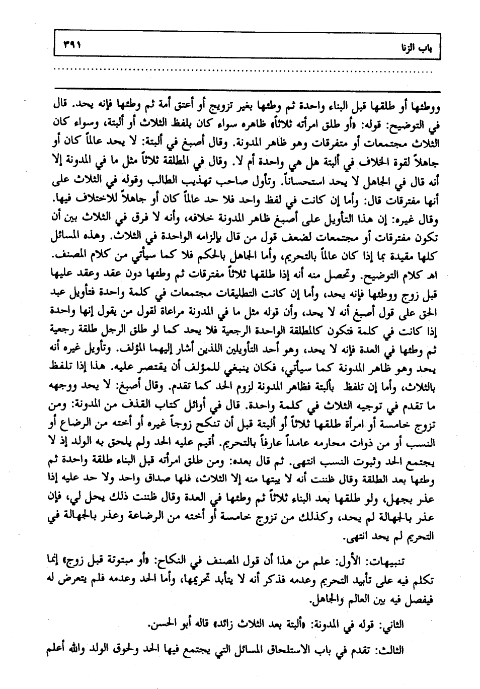 تنبيهات: الأول: علم من هذا أن قول المصنف في النكاح (أو مبتوتة) قبل زوج إنما تكلم فيه على تأبيد التحريم وعدمه فذكر أنه لا يتأبد تحريمها. وأما الحد وعدمه فلم يتعرض له فيفصل فيه بين العالم والجاهل.