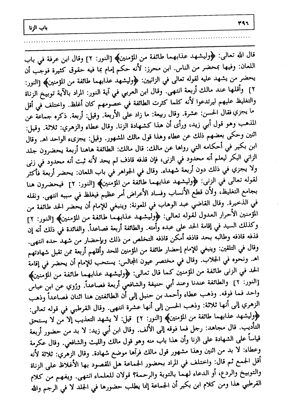قال الله تعالى: {وَلْيَشْهَدْ عَذَابَهُمَا طَائِفَةٌ مِنَ الْمُؤْمِنِينَ} [النور: من الآية2] وقال ابن عرفة في باب اللعان وفيها بمحضر من الناس. ابن محرز: لأنه حكم إمام بما فيه حقوق كثيرة فوجب أن يحضر من يشهد عليه لقوله تعالى في الزانيين: {وَلْيَشْهَدْ عَذَابَهُمَا طَائِفَةٌ مِنَ الْمُؤْمِنِينَ} [النور: من الآية2] وأقلها عند مالك أربعة انتهى. وقال ابن العربي في آية النور: المراد بالآية توبيخ الزناة والتغليظ عليهم ليرتدعوا لأنه كلما كثرت الطائفة في خصومهم كان أغلظ واختلف في أقل ما يجزئ فقال الحسن: عشرة وقال ربيعة: ما زاد على الأربعة وقيل: أربعة ذكره جماعة عن المذهب وهو قول أبي زيد، ورأى أن هذا كشهادة الزنا، وقال عطاء والزهري: ثلاثة، وقيل: اثنان. وحكى بعضهم ذلك عن عطاء وهذا قول مالك المشهور وقيل يجزئ الواحد ا هـ وقال ابن بكير في أحكامه التي رواها عن مالك: قال مالك: الطائفة ههنا أربعة يحضرون جلد الزاني البكر ليعلم أنه محدود في الزنى فإن قذفه قاذف لم يحد لأنه ثبت أنه محدود في زنى ولا يجزئ في ذلك دون أربعة شهداء وقال في الجواهر في باب اللعان: يحضر أربعة فأكثر؛ لقوله تعالى في الزنى: {وَلْيَشْهَدْ عَذَابَهُمَا طَائِفَةٌ مِنَ الْمُؤْمِنِينَ} [النور: من الآية2] فيحضرون هنا بجامع التغليظ ولأن قطع الأنساب وفساد الأعراض أمر عظيم فيغلظ في سببه انتهى. ونقله في الذخيرة وقال القاضي عبد الوهاب في المعونة: وينبغي للإمام أن يحضر الحد طائفة من المؤمنين الأحرار العدول؛ لقوله تعالى: {وَلْيَشْهَدْ عَذَابَهُمَا طَائِفَةٌ مِنَ الْمُؤْمِنِينَ} [النور: من الآية2] وكذلك السيد في إقامة الحد على عبده وأمته والطائفة أربعة فصاعدا والفائدة في ذلك أنه إن قذفه قاذفه وطالبه بحد قاذفه أمكن قاذفه التخلصمن ذلك وبإحضار من شهد حده انتهى. وقال في التلقين: وينبغي للإمام إحضار طائفة من المؤمنين للحد. وأقلهم أربعة ممن تقبل شهادتهم. ا هـ ونحوه في الجلاب وقال في مختصر عيون المجالس: يستحب للإمام أن يحضر في إقامة الحد في الزنى طائفة من المؤمنين كما قال تعالى: {وَلْيَشْهَدْ عَذَابَهُمَا طَائِفَةٌ مِنَ الْمُؤْمِنِينَ} [النور: من الآية2] والطائفة عندنا وعند أبي حنيفة والشافعي أربعة فصاعدا وروي عن ابن عباس واحد فما فوقه وذهب عطاء وأحمد بن حنبل إلى أن الطائفتين هنا اثنان فصاعدا وذهب الزهري إلى أنها ثلاثة. وذهب الحسن إلى أنها عشرة انتهى. وقال القرطبي في قوله تعالى: {وَلْيَشْهَدْ عَذَابَهُمَا طَائِفَةٌ مِنَ الْمُؤْمِنِينَ} [النور: من الآية2] قيل: لا يشهد التعذيب إلا من لا يستحق التأديب. قال مجاهد: رجل فما فوقه إلى الألف. وقال ابن أبي زيد: لا بد من حضور أربعة قياسا على الشهادة على الزنا، وإن هذا باب منه وهو قول مالك والليث والشافعي وقال عكرمة وعطاء: لا بد من اثنين وهذا مشهور قول مالك فرآها موضع شهادة وقال الزهري: ثلاثة؛ لأنه أقل الجمع ثم قال: واختلف في المراد بحضور الجماعة هل المقصود بها الإغلاظ على الزناة والتوبيخ والردع أو الدعاء لهما بالتوبة والرحمة؟ قولان للعلماء انتهى. ويفهم من كلام القرطبي هذا ومن كلام ابن بكير أن الجماعة إنما يطلب حضورها في الجلد لا في الرجم والله