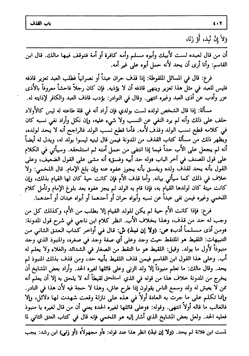 أن من قال لعبده: لست لأبيك وأبوه مسلم وأمه كافرة أو أمة فتوقف فيها مالك قال ابن القاسم وأنا أرى أن يحد لأنه حمل أبوه على غير أمه.