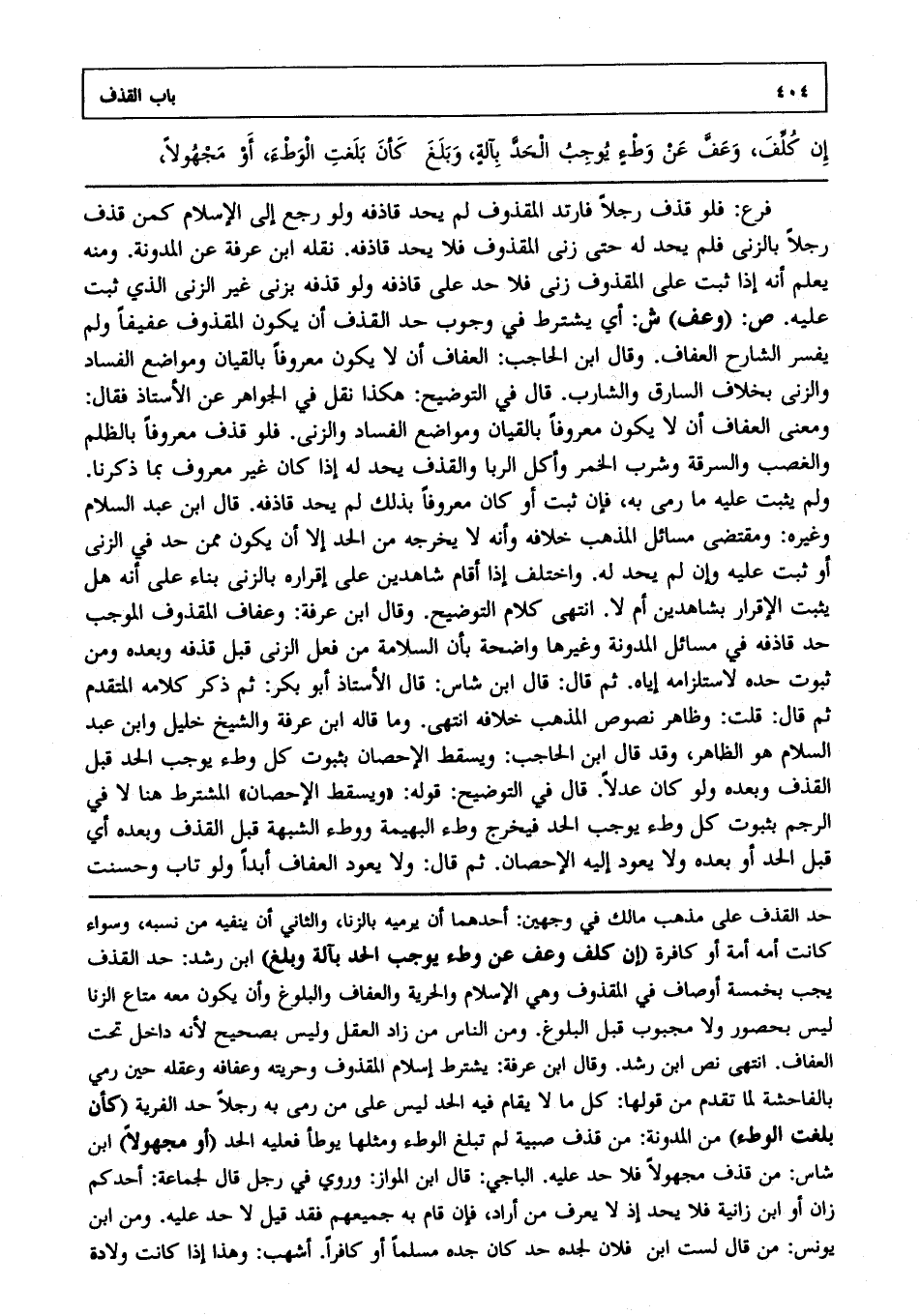 ص: (وعف) ش: أي يشترط في وجوب حد القذف أن يكون المقذوف عفيفا ولم يفسر الشارح العفاف وقال ابن الحاجب: العفاف أن لا يكون معروفا بالقيان ومواضع الفساد والزنى، بخلاف السارق والشارب قال في التوضيح: هكذا نقل في الجواهر عن الأستاذ فقال: ومعنى العفاف أن لا يكون معروفا بالقيان ومواضع الفساد والزنى، فلو قذف معروفا بالظلم والغصب والسرقة وشرب الخمر وأكل الربا والقذف يحد له إذا كان غير معروف بما ذكرنا ولم يثبت عليه ما رمى به فإن ثبت أو كان معروفا بذلك لم يحد قاذفه. قال ابن عبد السلام وغيره: ومقتضى مسائل المذهب خلافه وأنه لا يخرجه من الحد إلا أن يكون ممن حد في الزنى أو ثبت عليه وإن لم يحد له واختلف إذا أقام شاهدين على إقراره بالزنى بناء على أنه هل يثبت الإقرار بشاهدين أم لا انتهى كلام التوضيح. وقال ابن عرفة: وعفاف المقذوف الموجب حد قاذفه في مسائل المدونة وغيرها واضحة بأن السلامة من فعل الزنى قبل قذفه وبعده ومن ثبوت حده لاستلزامه إياه ثم قال: قال ابن شاس": قال الأستاذ أبو بكر ثم ذكر كلامه المتقدم ثم قال: قلت: وظاهر نصوص المذهب خلافه انتهى. وما قاله ابن عرفة والشيخ خليل وابن عبد السلام هو الظاهر. وقد قال ابن الحاجب: ويسقط الإحصان بثبوت كل وطء يوجب الحد قبل القذف وبعده ولو كان عدلا قال في التوضيح: قوله: "ويسقط الإحصان" المشترط هنا لا في الرجم بثبوت كل وطء يوجب الحد فيخرج وطء البهيمة ووطء الشبهة قبل القذف وبعده أي قبل الحد أو بعده ولا يعود إليه الإحصان، ثم قال: ولا يعود العفاف أبدا ولو تاب وحسنت