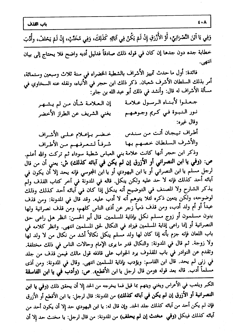 ص: (وفي: يا ابن النصراني، أو الأزرق. إن لم يكن في آبائه كذلك) ش: يعني أن من قال لرجل مسلم: يا ابن النصراني أو يا ابن اليهودي أو يا ابن المجوسي فإنه يحد إلا أن يكون في آبائه أحد كذلك فإنه لا حد عليه ولكن ينكل. قاله في المدونة في آخر كتاب القذف ولم يذكر الشارح ولا المصنف في التوضيح أنه ينكل إذا كان في آبائه أحد كذلك وذلك لوضوحه ولكن يتعين ذكره لئلا يتوهم أنه لا أدب عليه.