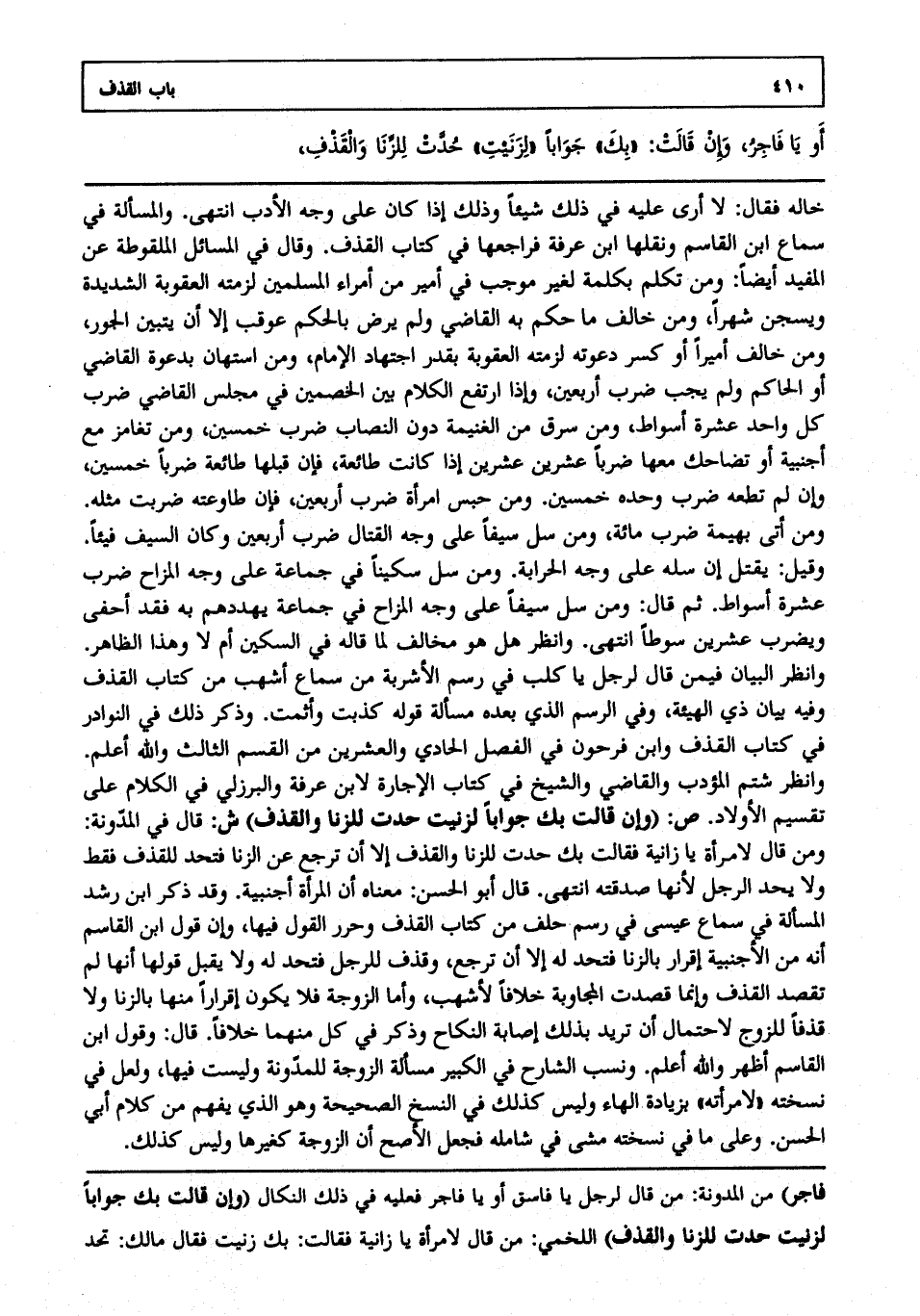 فَاجِرُ) مِنْ الْمُدَوَّنَةِ: مَنْ قَالَ لِرَجُلٍ يَا فَاسِقُ أَوْ يَا فَاجِرُ فَعَلَيْهِ فِي ذَلِكَ النَّكَالُ.