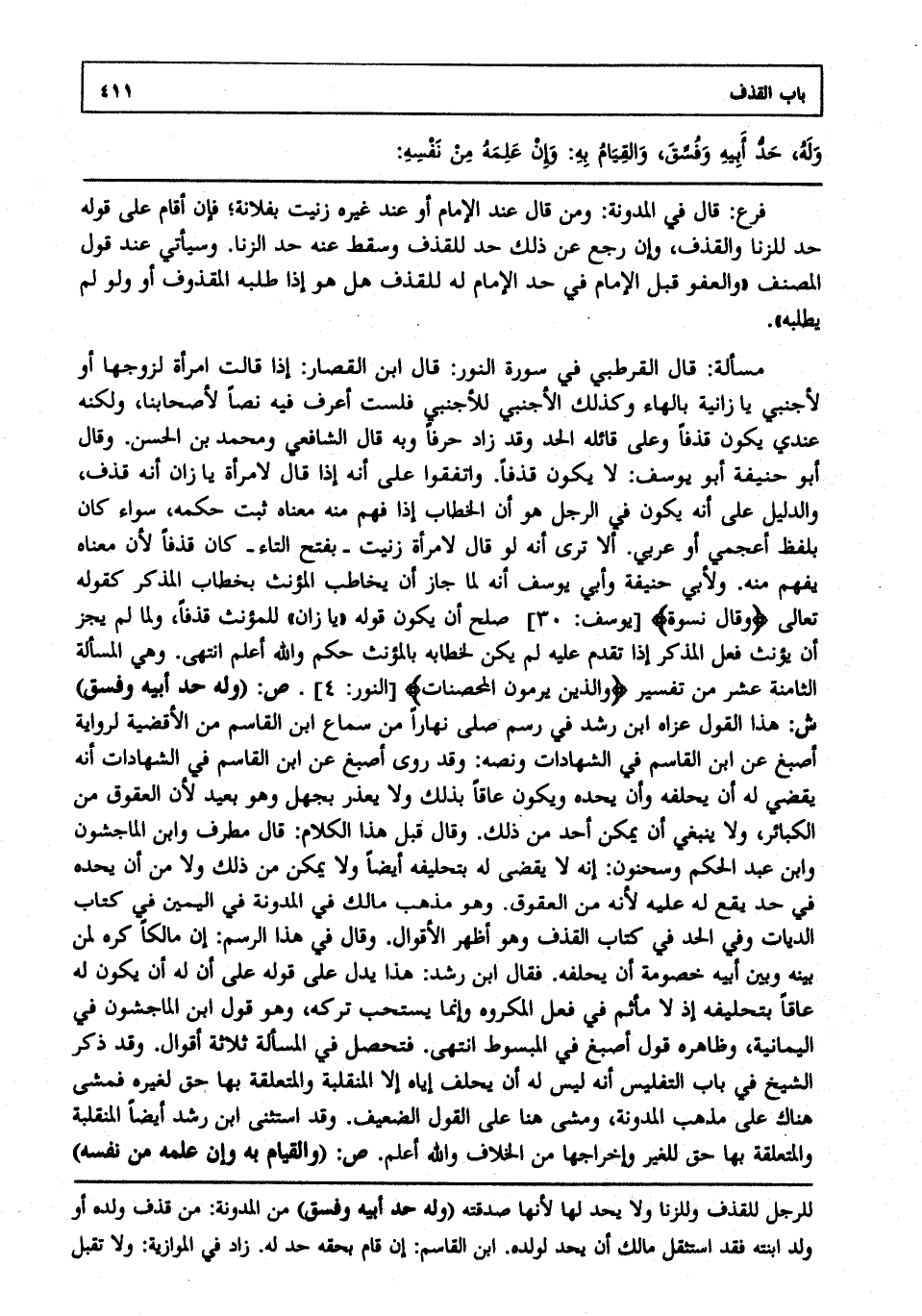 مسألة: قال القرطبي في سورة النور: قال ابن القصار: إذا قالت امرأة لزوجها أو لأجنبي يا زانيه بالهاء وكذلك الأجنبي للأجنبي فلست أعرف فيه نصا لأصحابنا ولكنه عندي يكون قذفا وعلى قائله الحد وقد زاد حرفا وبه قال الشافعي ومحمد بن الحسن، وقال أبو حنيفة وأبو يوسف: لا يكون قذفا واتفقوا على أنه إذا قال لامرأة: يا زان أنه قذف والدليل على أنه يكون في الرجل هو أن الخطاب إذا فهم منه معناه ثبت حكمه سواء كان بلفظ أعجمي أو عربي. ألا ترى أنه لو قال لامرأة: زنيت بفتح التاء كان قذفا؟، لأن معناه يفهم منه ولأبي حنيفة وأبي يوسف أنه لما جاز أن يخاطب المؤنث بخطاب المذكر كقوله تعالى: {وَقَالَ نِسْوَةٌ } [يوسف: من الآية30] صلح أن يكون قوله: "يا زان: للمؤنث قذفا ولما لم يجز أن يؤنث فعل المذكر إذا تقدم عليه لم يكن لخطابه بالمؤنث حكم والله أعلم. انتهى وهي المسألة الثامنة عشر من تفسير {وَالَّذِينَ يَرْمُونَ الْمُحْصَنَاتِ} [النور: من الآية4] ص: (وله حد أبيه وفسق) ش: هذا القول عزاه ابن رشد في رسم صلى نهارا من سماع ابن القاسم من الأقضية لرواية أصبغ عن ابن القاسم في الشهادات ونصه وقد روى أصبغ عن ابن القاسم في الشهادات أنه يقضي له وأن يحلفه وأن يحده ويكون عاقا بذلك ولا يعذر بجهل وهو بعيد لأن العقوق من الكبائر ولا ينبغي أن يمكن أحد من ذلك. وقال قبل هذا الكلام: قال مطرف وابن الماجشون وابن عبد الحكم وسحنون: أنه لا يقضي له بتحليفه أيضا ولا يمكن من ذلك ولا من أن يحده في حد يقع له عليه لأنه من العقوق وهو مذهب مالك في المدونة وفي اليمين في كتاب الديات وفي الحد في كتاب القذف وهو أظهر الأقوال وقال في هذا الرسم: إن مالكا كره لمن بينه وبين أبيه خصومة أن يحلفه فقال ابن رشد: هذا بدل من قوله: "على أن له أن يكون له عاقا بتحليفه" إذ لا مأثم في فعل المكروه وإنما يستحب تركه وهو قول ابن الماجشون في اليمانية، وظاهر قول أصبغ في المبسوط انتهى. فتحصل في المسألة ثلاثة أقوال وقد ذكر في باب التفليس أنه ليس له أن يحلف أباه إلا المنقلبة والمتعلقة بها حق لغيره فمشى هناك على مذهب المدونة ومشى هنا على القول الضعيف وقد استثنى ابن رشد أيضا المنقلبة والمتعلقة بها حق للغير وإخراجها من الخلاف والله أعلم. ص: (والقيام به وإن علمه من نفسه)