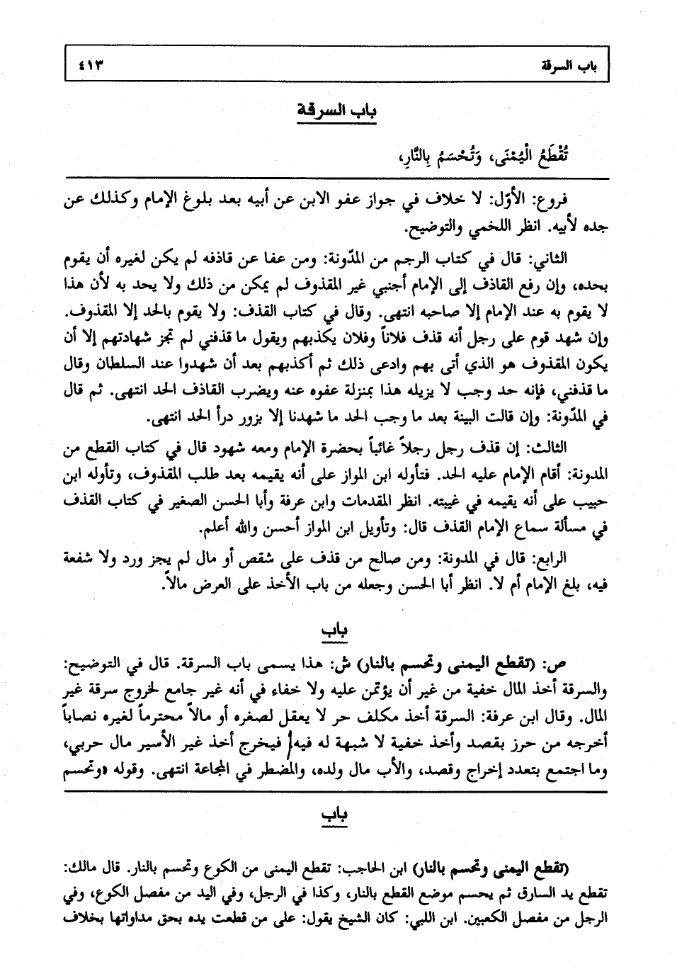 ص: (تقطع اليمنى وتحسم بالنار) ش: هذا يسمى باب السرقة قال في التوضيح: والسرقة أخذ المال خفية من غير أن يؤتمن عليه ولا خفاء في أنه غير جامع لخروج سرقة غير المال وقال ابن عرفة: السرقة أخذ مكلف حر لا يعقل لصغره أو مالا محترما لغيره نصابا أخرجه من حرز بقصد وأخذ خفية لا شبهة له فيه. فيخرج أخذ غير الأسير مال حربي وما اجتمع بتعدد إخراج وقصد، والأب مال ولده والمضطر في المجاعة انتهى. وقوله: "وتحسم