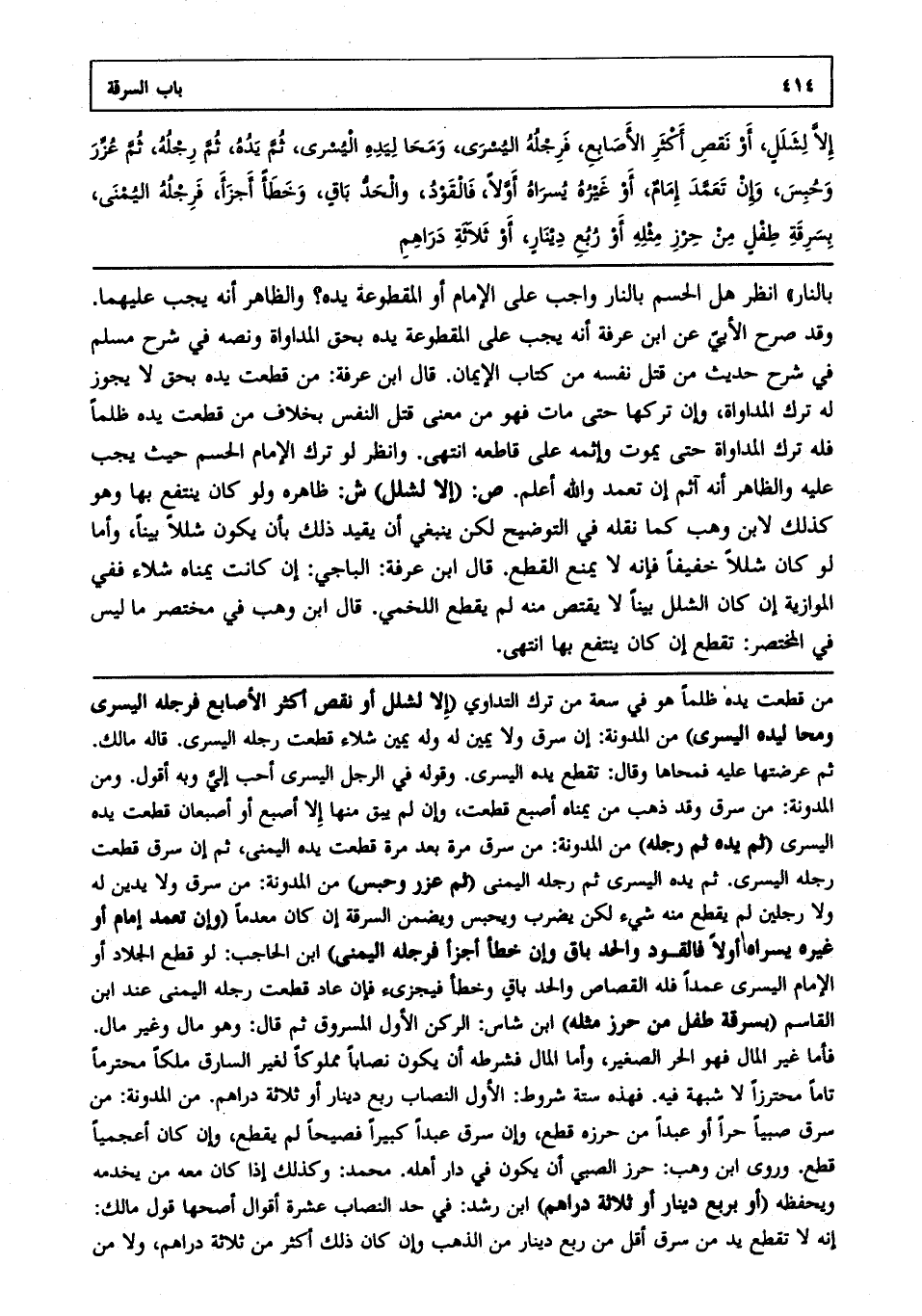 بالنار" انظر هل الحسم بالنار واجب على الإمام أو المقطوعة يده والظاهر أنه يجب عليهما وقد صرح الآبي عن ابن عرفة أنه يجب على المقطوعة يده بحق المداواة ونصه في شرح مسلم في شرح حديث من قتل نفسه من كتاب الأيمان قال ابن عرفة: من قطعت يده بحق لا يجوز له ترك المداواة وإن تركها حتى مات فهو من معنى قتل النفس بخلاف من قطعت يده ظلما فله ترك المداواة حتى يموت وإثمه على قاطعه انتهى. وانظر لو ترك الإمام الحسم حيث يجب عليه والظاهر أنه آثم إن تعمد والله أعلم. ص. (إلا لشلل) ش: ظاهره ولو كان ينتفع بها وهو كذلك لابن وهب كما نقله في التوضيح لكن ينبغي أن يقيد ذلك بأن يكون شللا بينا وأما لو كان شللا خفيفا فإنه لا يمنع القطع قال ابن عرفة الباجي إن كانت يمناه شلاء ففي الموازية إن كان الشلل بينا لا يقتص منه لم يقطع. اللخمي: قال ابن وهب في مختصر ما ليس في المختصر: تقطع إن كان ينتفع بها انتهى.