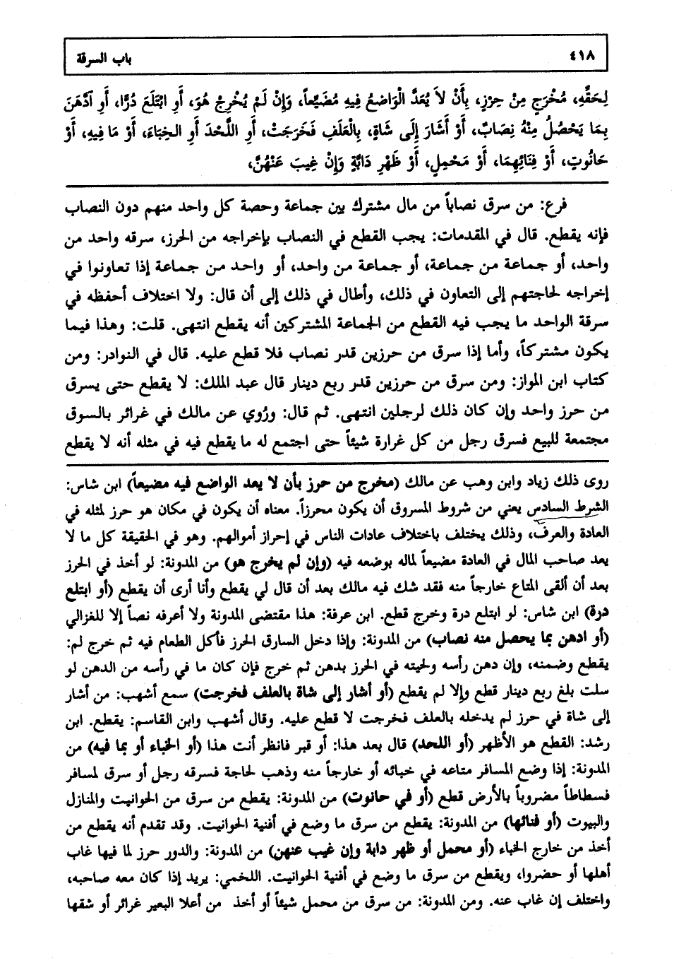 فرع: من سرق نصابا من مال مشترك بين جماعة، وحصة كل واحد منهم دون النصاب فإنه يقطع قال في المقدمات يجب القطع في النصاب بإخراجه من الحرز؛ سرقه واحد من واحد أو جماعة من جماعة أو جماعة من واحد أو واحد من جماعة إذا تعاونوا في إخراجه لحاجتهم إلى التعاون في ذلك وأطال في ذلك إلى أن قال ولا اختلاف أحفظه في سرقة الواحد ما يجب فيه القطع من الجماعة المشتركين أنه يقطع انتهى. قلت: وهذا فيما يكون مشتركا وأما إذا سرق من حرزين قدر نصاب فلا قطع عليه قال في النوادر ومن كتاب ابن المواز: ومن سرق من حرزين قدر ربع دينار قال عبد الملك: لا يقطع حتى يسرق من حرز واحد وإن كان ذلك لرجلين انتهى.
