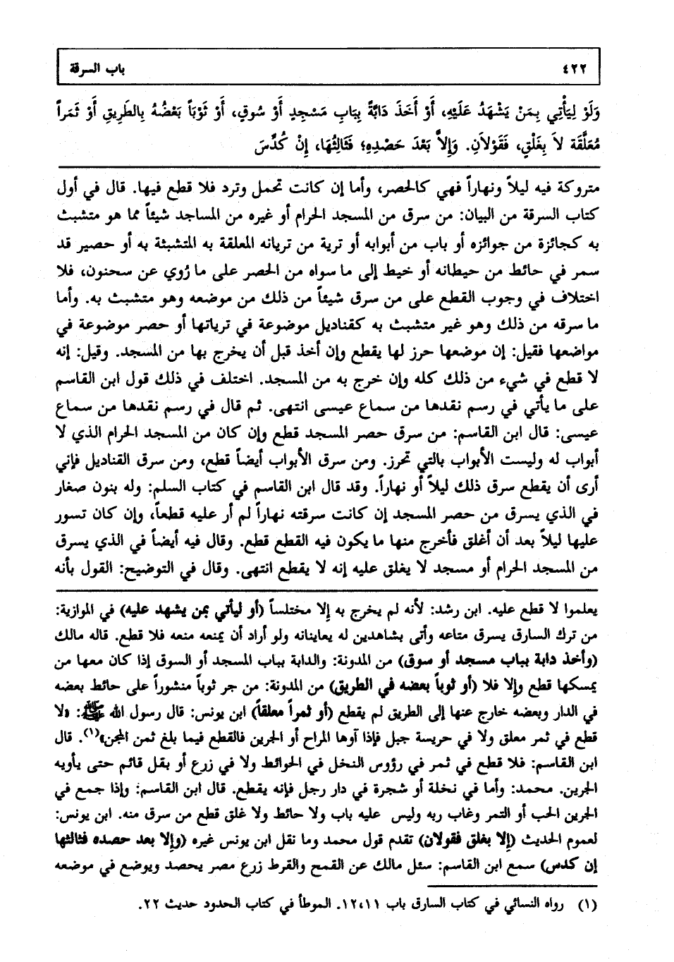 متروكة فيه ليلا ونهارا فهي كالحصر، وأما إن كانت تحمل وترد فلا قطع فيها. قال في أول كتاب السرقة من البيان: من سرق من المسجد الحرام أو غيره من المساجد شيئا مما هو متشبث به كجائزة من جوائزه أو باب من أبوابه أو ترية من تريانه المعلقة به المتشبثة أو حصير قد سمر في حائط من حيطانه، أو خيط إلى ما سواه من الحصر على ما روي عن سحنون، فلا اختلاف في وجوب القطع على من سرق شيئا من ذلك من موضعه وهو متشبث به وأما ما سرقه من ذلك وهو غير متشبث به كقناديل موضوعة في ترياتها أو حصر موضوعة في مواضعها فقيل إن موضعها حرز لها يقطع وإن أخذ قبل أن يخرج بها من المسجد، وقيل: أنه لا قطع في شيء من ذلك كله وإن خرج به من المسجد اختلف في ذلك قول ابن القاسم على ما يأتي في رسم نقدها من سماع عيسى انتهى. ثم قال في رسم نقدها من سماع عيسى: قال ابن القاسم: من سرق حصر المسجد قطع وإن كان من المسجد الحرام الذي لا أبواب له وليست الأبواب بالتي تحرز ومن سرق الأبواب أيضا قطع ومن سرق القناديل فإني أرى أن يقطع سرق ذلك ليلا أو نهارا، وقد قال ابن القاسم في كتاب السلم: وله بنون صغار في الذي يسرق من حصر المسجد إن كانت سرقته نهارا لم أر عليه قطعا. وإن كان تسور عليها ليلا بعد أن أغلق فأخرج منها ما يكون فيه القطع قطع، وقال فيه أيضا في الذي يسرق من المسجد الحرام أو مسجد لا يغلق عليه: أنه لا يقطع انتهى. وقال في التوضيح: القول بأنه