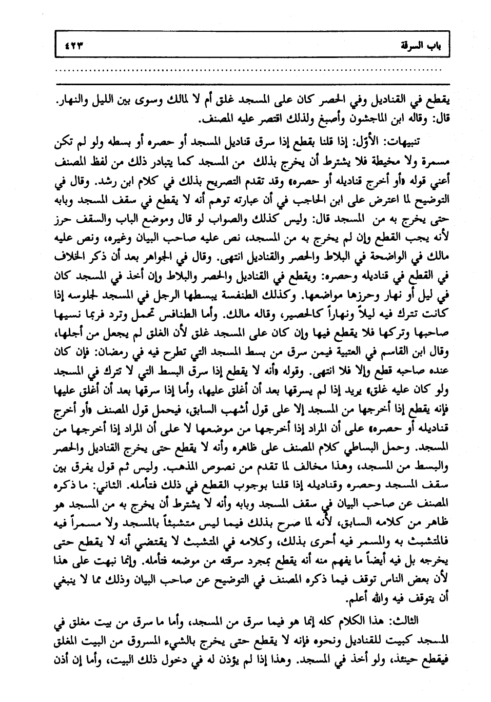 تنبيهات: الأول: إذا قلنا: يقطع إذا سرق قناديل المسجد أو حصره أو بسطه ولو لم تكن مسمرة ولا مخيطة فلا يشترط أن يخرج بذلك من المسجد كما يتبادر ذلك من لفظ المصنف أعني قوله: "أو أخرج قناديله أو حصره" وقد تقدم التصريح بذلك في كلام ابن رشد، وقال في التوضيح لما اعترض على ابن الحاجب في أن عبارته توهم أنه لا يقطع في سقف المسجد وبابه حتى يخرج به من المسجد قال: وليس كذلك، والصواب لو قال: وموضع الباب والسقف حرز؛ لأنه يجب القطع وإن لم يخرج به من المسجد نص عليه صاحب البيان وغيره، ونص عليه مالك في الواضحة في البلاط والحصر والقناديل انتهى، وقال في الجواهر بعد أن ذكر الخلاف في القطع في قناديله وحصره: ويقطع في القناديل والحصر والبلاط وإن أخذ في المسجد كان في ليل أو نهار وحرزها مواضعها وكذلك الطنفسة يبسطها الرجل في المسجد لجلوسه إذا كانت تترك فيه ليلا ونهارا كالحصير. وقاله مالك وأما الطنافس تحمل وترد فربما نسيها صاحبها وتركها فلا يقطع فيها وإن كان على المسجد غلق لأن الغلق لم يجعل من أجلها. وقال ابن القاسم في العتبية فيمن سرق من بسط المسجد التي تطرح فيه في رمضان: فإن كان عنده صاحبه قطع وإلا فلا انتهى. وقوله: "أنه لا يقطع إذا سرق البسط التي لا تترك في المسجد ولو كان عليه غلق" يريد إذا لم يسرقها بعد أن أغلق عليها وأما إذا سرقها بعد أن أغلق عليها فإنه يقطع إذا أخرجها من المسجد إلا على قول أشهب السابق فيحمل قول المصنف: "أو أخرج قناديله أو حصره" على أن المراد إذا أخرجها من موضعها لا على أن المراد أنه أخرجها من المسجد وحمل البساطي كلام المصنف على ظاهره وأنه لا يقطع حتى يخرج القناديل والحصر والبسط من المسجد وهذا مخالف لما تقدم من نصوص المذهب وليس ثم قول يفرق بين سقف المسجد وحصره وقناديله إذا قلنا بوجوب القطع في ذلك فتأمله.