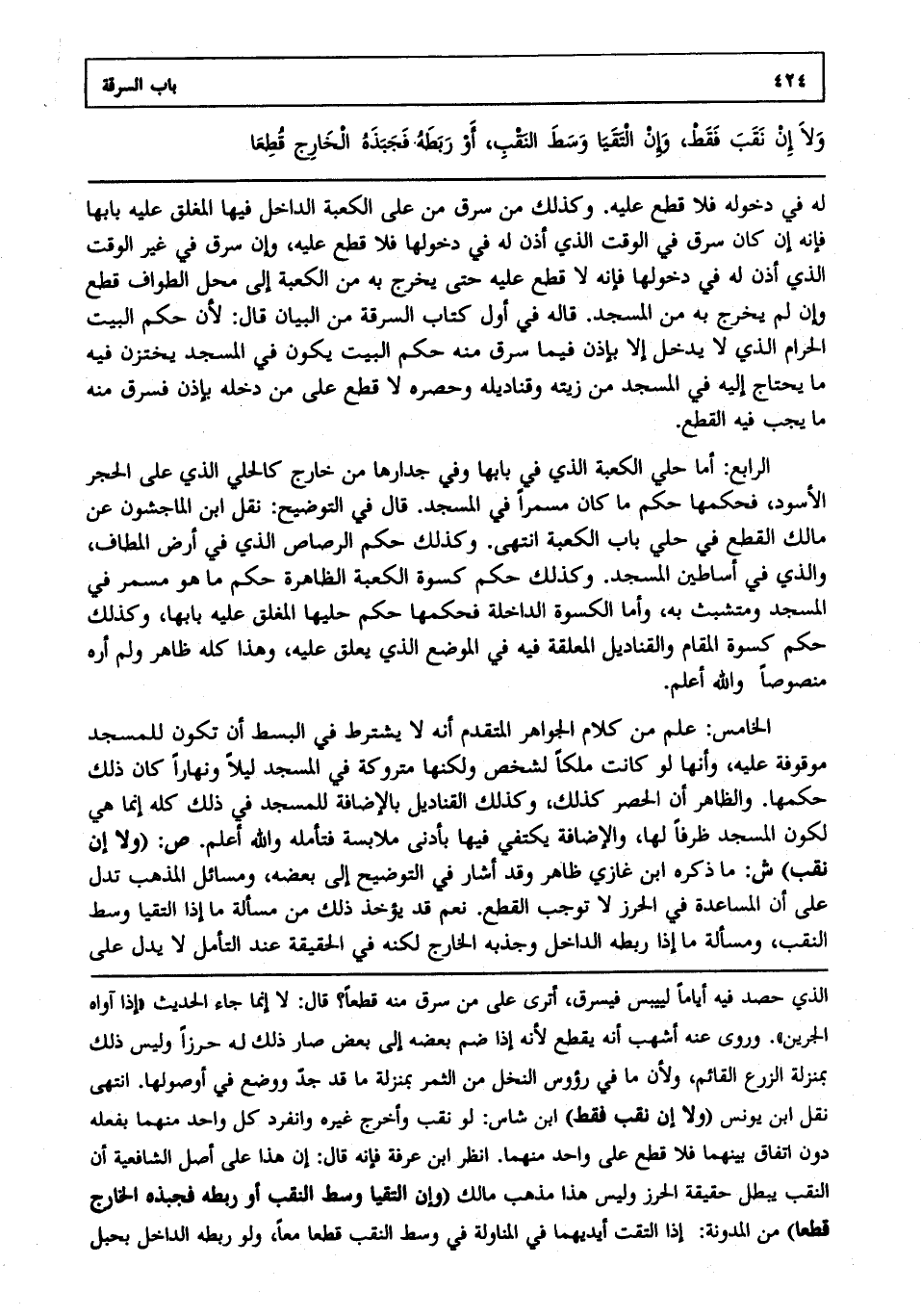 الرابع: أما حلي الكعبة الذي في بابها وفي جدارها من خارج كالحلي الذي على الحجر الأسود فحكمه حكم ما كان مسمرا في المسجد قال في التوضيح: نقل ابن الماجشون عن مالك القطع في حلي باب الكعبة انتهى. وكذلك حكم الرصاص الذي في أرض المطاف والذي في أساطين المسجد وكذلك حكم كسوة الكعبة الظاهرة حكم ما هو مسمر في المسجد ومتشبث به وأما الكسوة الداخلة فحكمها حكم حليها المغلق عليه بابها وكذلك حكم كسوة المقام والقناديل المعلقة فيه في الموضع الذي يعلق عليه، وهذا كله ظاهر ولم أره منصوصا والله أعلم.