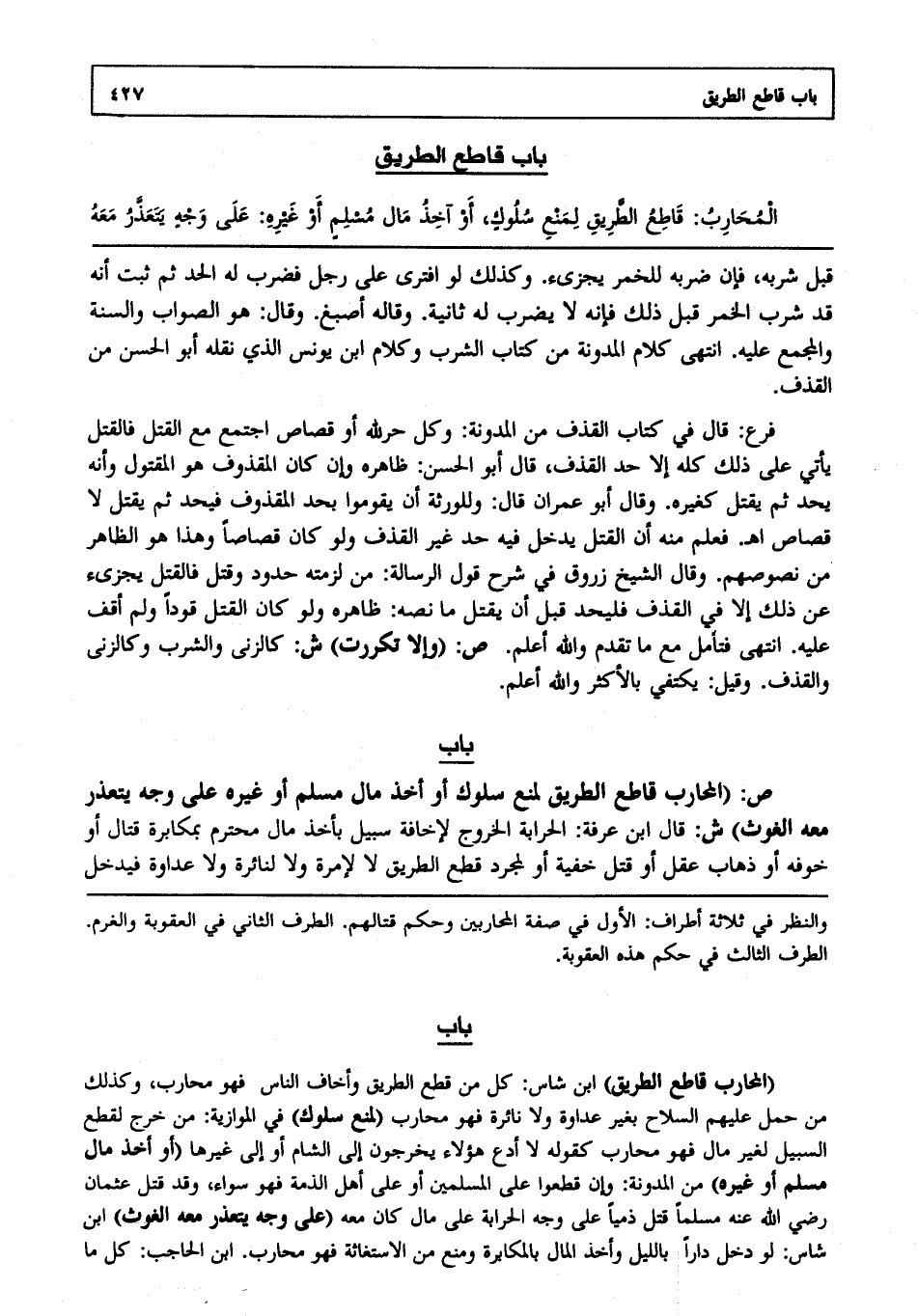 المحارب قاطع الطريق لمنع سلوك، أو آخذ مال مسلم، أو غيره على وجه يتعذر معه