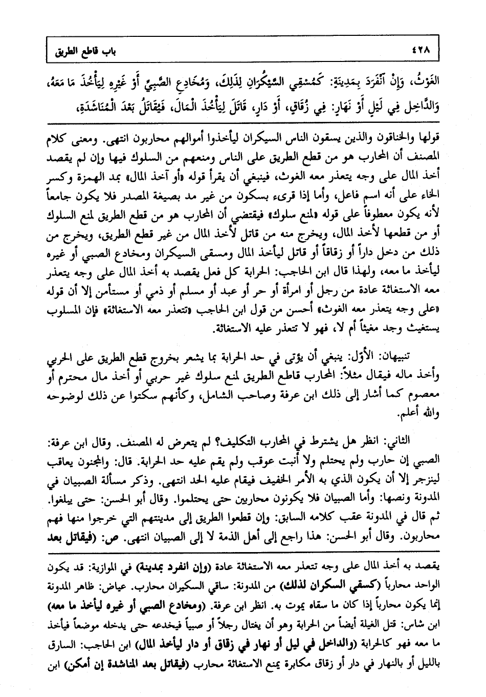 قولها والخناقون والذين يسقون الناس السيكران ليأخذوا أموالهم محاربون انتهى. ومعنى كلام المصنف أن المحارب هو من قطع الطريق على الناس ومنعهم من السلوك فيها وإن لم يقصد أخذ المال على وجه يتعذر معه الغوث فينبغي أن يقرأ قوله أو آخذ المال بمد الهمزة وكسر الخاء على أنه اسم فاعل وأما إذا قرئ بسكون من غير مد بصيغة المصدر فلا يكون جامعا لأنه يكون معطوفا على قوله لمنع سلوك فيقتضي أن المحارب هو من قطع الطريق لمنع السلوك أو من قطعها لأخذ المال ويخرج منه من قاتل لأخذ المال من غير قطع الطريق ويخرج من ذلك من دخل دارا أو زقاقا أو قاتل ليأخذ المال ومسقي السيكران ومخادع الصبي أو غيره ليأخذ ما معه، ولهذا قال ابن الحاجب: الحرابة كل فعل يقصد به أخذ المال على وجه يتعذر معه الاستغاثة عادة من رجل أو امرأة أو حر أو عبد أو مسلم أو ذمي أو مستأمن. إلا أن قوله: "على وجه يتعذر معه الغوث" أحسن من قول ابن الحاجب: "تتعذر معه الاستغاثة". فإن المسلوب يستغيث وجد مغيثا أم لا فهو لا تتعذر عليه الاستغاثة.