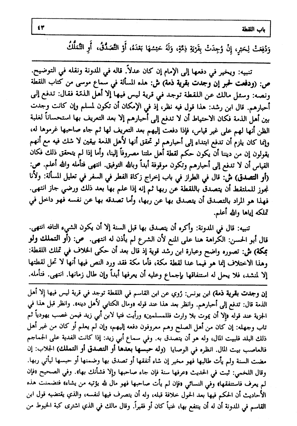 تنبيه: قَالَ فِي الْمُدَوَّنَةِ: وَأَكْرَهُ أَنْ يَتَصَدَّقَ بِهَا قَبْلَ السَّنَةِ إلَّا أَنْ يَكُونَ الشَّيْءُ التَّافِهُ، انْتَهَى. قَالَ أَبُو الْحَسَنِ: الْكَرَاهَةُ هُنَا عَلَى الْمَنْعِ؛ لِأَنَّ الشَّرْعَ لَمْ يَأْذَنْ لَهُ، انْتَهَى.