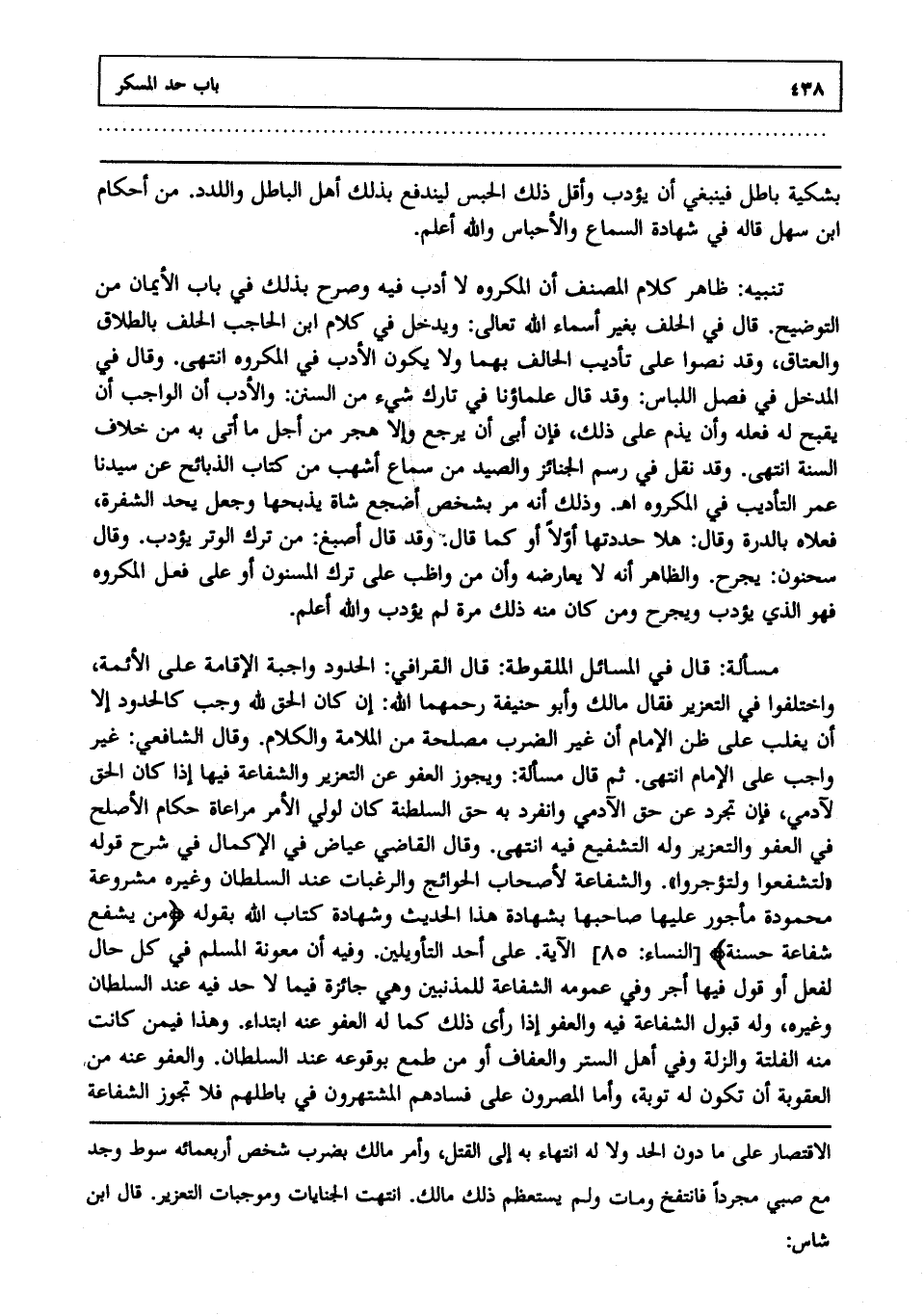 ثم قال: مسألة: ويجوز العفو عن التعزير والشفاعة فيها إذا كان الحق لآدمي فإن تجرد عن حق الآدمي وانفرد به حق السلطنة كان لولي الأمر مراعاة حكم الأصلح في العفو والتعزير وله التشفيع فيه انتهى. وقال القاضي عياض في الإكمال في شرح قوله "لتشفعوا ولتؤجروا": والشفاعة لأصحاب الحوائج والرغبات عند السلطان وغيره مشروعة محمودة مأجور عليها صاحبها بشهادة هذا الحديث وشهادة كتاب الله بقوله: {مَنْ يَشْفَعْ شَفَاعَةً حَسَنَةً} الآية [النساء: من الآية85] على أحد التأويلين وفيه أن معونة المسلم في كل حال لفعل أو قول فيها أجر وفي عمومه الشفاعة للمذنبين وهي جائزة فيما لا حد فيه عند السلطان وغيره، وله قبول الشفاعة فيه والعفو إذا رأى ذلك، كما له العفو عنه ابتداء، وهذا فيمن كانت منه الفلتة والزلة، وفي أهل الستر والعفاف أو من طمع بوقوعه عند السلطان، والعفو عنه من العقوبة أن تكون له توبة، وأما المصرون على فسادهم المشتهرون في باطلهم فلا تجوز الشفاعة