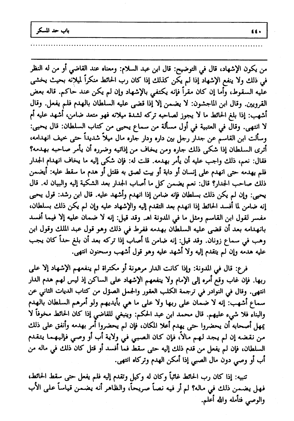 من يكون الإشهاد قال في التوضيح: قال ابن عبد السلام: ومعناه عند القاضي أو من له النظر في ذلك ولا ينفع الإشهاد إذا لم يكن كذلك إذا كان رب الحائط منكرا لميلانه بحيث يخشى عليه السقوط وأما إن كان مقرا فإنه يكتفي بالإشهاد وإن لم يكن عند حاكم قاله بعض القرويين. وقال ابن الماجشون: لا يضمن إلا إذا قضى عليه السلطان بالهدم فلم يفعل وقال أشهب: إذا بلغ الحائط ما لا يجوز لصاحبه تركه لشدة ميلانه فهو متعد ضامن أشهد عليه أم لا انتهى. وقال في العتبية في أول مسألة من سماع يحيى من كتاب السلطان: قال يحيى: وسألت ابن القاسم عن جدار رجل بين داره ودار جاره مال ميلا شديدا حتى خيف انهدامه أترى السلطان إذا شكا ذلك جاره ومن يخاف من إذايته وضرره أن يأمر صاحبه بهدمه؟ فقال: نعم ذلك واجب عليه أن يأمره بهدمه قلت له فإن شكا إليه ما يخاف انهدام الجدار فلم يهدمه حتى انهدم على إنسان أو دابة أو بيت لصق به فقتل أو هدم ما سقط عليه أيضمن ذلك صاحب الجدار؟ قال: نعم يضمن كل ما أصاب الجدار بعد الشكية إليه والبيان له قال يحيى: وإن لم يكن ذلك بسلطان فإنه ضامن إذا انهدم وأشهد عليه قال ابن رشد: قول يحيى إنه ضامن لما أفسد الحائط إذا انهدم بعد التقدم إليه والإشهاد عليه وإن لم يكن ذلك بسلطان مفسر لقول ابن القاسم: ومثل ما في المدونة ا هـ. وقد قيل: إنه لا ضمان عليه إلا فيما أفسد بانهدامه بعد أن قضى عليه السلطان بهدمه ففرط في ذلك وهو قول عبد الملك وقول ابن وهب في سماع زونان: وقد قيل: إنه ضامن لما أصاب إذا تركه بعد أن بلغ حدا كان يجب عليه هدمه وإن لم يتقدم إليه ولا أشهد عليه وهو قول أشهب وسحنون انتهى.