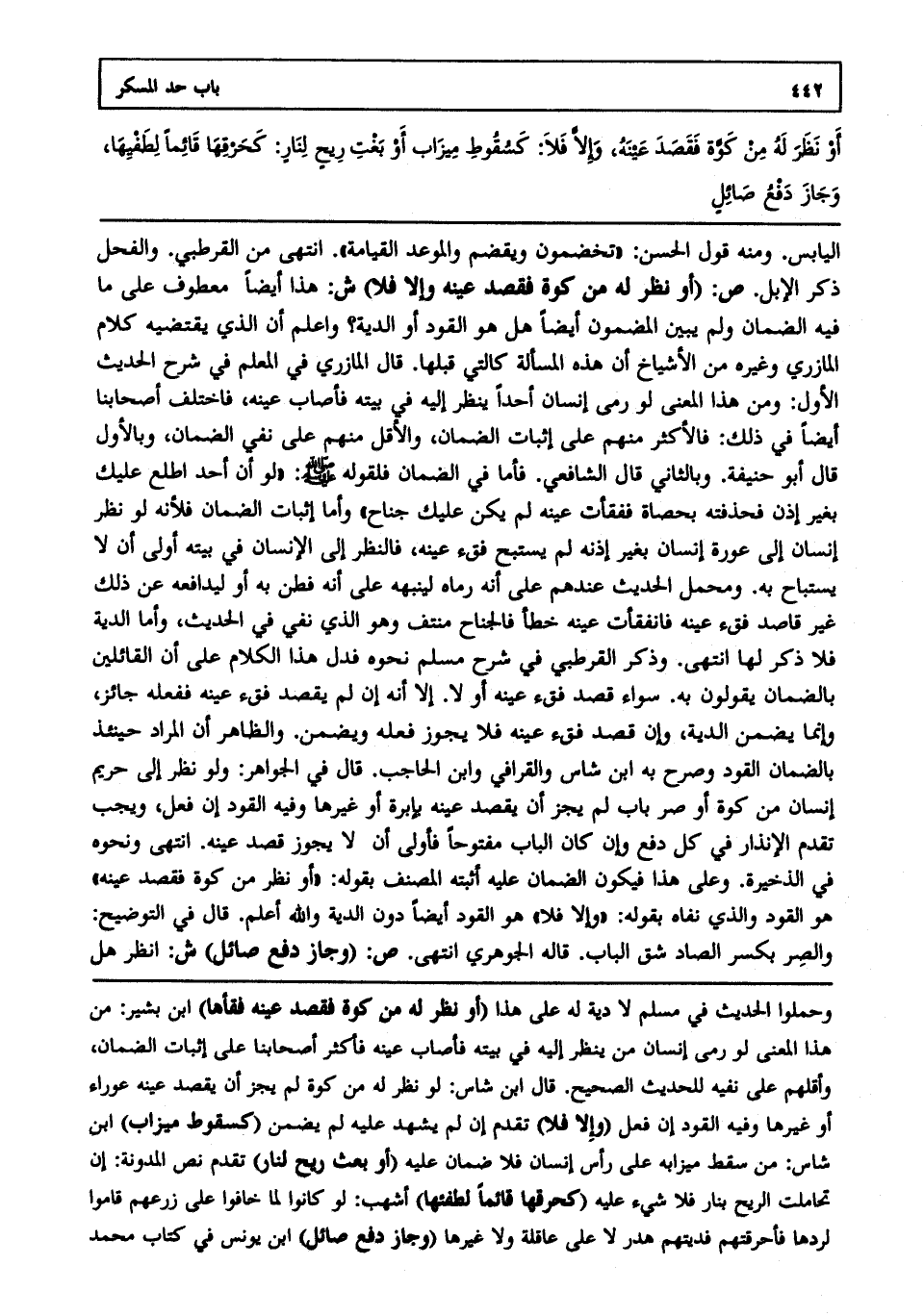 قال في الجواهر: ولو نظر إلى حريم إنسان من كوة أو صر باب، لم يجز أن يقصد عينه بإبرة أو غيرها وفيه القود إن فعل ويجب تقدم الإنذار في كل دفع وإن كان الباب مفتوحا فأولى أن لا يجوز قصد عينه انتهى. ونحوه في الذخيرة وعلى هذا فيكون الضمان الذي أثبته المصنف بقوله: "أو نظر من كوة فقصد عينه" هو القود والذي نفاه بقوله: "وإلا فلا" هو القود أيضا دون الدية والله أعلم. قال في التوضيح: والصر بكسر الصاد شق الباب. قاله الجوهري انتهى.