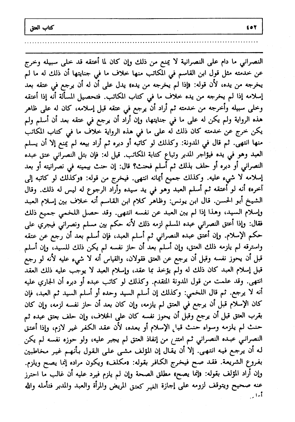 النصراني ما دام على النصرانية لا يمنع من ذلك، وإن كان لما أعتقه قد خلى سبيله وخرج عن خدمته مثل قول ابن القاسم في المكاتب منها خلاف ما في جنايتها: إن ذلك له ما لم يخرجه من يده؛ لأن قوله: "إذا لم يخرجه من يده" يدل على أن له أن يرجع في عتقه بعد إسلامه إذا لم يخرجه من يده خلاف ما في كتاب المكاتب فتحصيل المسألة أنه إذا أعتقه وخلى سبيله وأخرجه من خدمته، ثم أراد أن يرجع في عتقه قبل إسلامه كان له على ظاهر هذه الرواية ولم يكن له على ما في جنايتها، وإن أراد أن يرجع في عتقه بعد أن أسلم ولم يكن خرج عن خدمته كان ذلك له على ما في هذه الرواية خلاف ما في كتاب المكاتب منها انتهى. ثم قال في المدونة: وكذلك لو كاتبه أو دبره، ثم أراد بيعه لم يمنع إلا أن يسلم العبد، وهو في يده فيؤاجر المدبر وتباع كتابة المكاتب قيل له: فإن بتل النصراني عتق عبده النصراني أو دبره أو حلف بذلك، ثم أسلم فحنث، قال: إن حنث بيمينه في نصرانيته أو بعد إسلامه لا شيء عليه وكذلك جميع أيمانه انتهى. فيخرج من قوله: "وكذلك لو كاتبه إلى آخره" أنه لو أعتقه، ثم أسلم العبد، وهو في يد سيده وأراد الرجوع له ليس له ذلك، وقال الشيخ أبو الحسن: قال ابن يونس: وظاهر كلام ابن القاسم أنه خلاف بين إسلام العبد وإسلام السيد وهذا إذا لم يبن العبد عن نفسه انتهى. وقد حصل اللخمي جميع ذلك فقال: وإذا أعتق النصراني عبده لزمه ذلك؛ لأنه حكم بين مسلم ونصراني فيجري على حكم الإسلام، وإن أعتق عبده النصراني، ثم أسلم العبد فإن أسلم بعد أن رجع عن عتقه واسترقه لم يلزمه ذلك العتق، وإن أسلم بعد أن حاز نفسه لم يكن ذلك للسيد، وإن أسلم قبل أن يحوز نفسه وقبل أن يرجع عن العتق، فقولان والقياس: أنه لا شيء عليه؛ لأنه لو رجع قبل إسلام العبد كان ذلك له ولم يؤخذ بما عقد وإسلام العبد لا يوجب عليه ذلك العقد انتهى. وقد علمت من قول المدونة المتقدم: "وكذلك لو كاتب عبده أو دبره" أن الجاري عليه أنه لا يرجع، ثم قال اللخمي وكذلك إن أسلم السيد وحده أو أسلم السيد، ثم العبد فإن كان الإسلام قبل أن رجع في العتق لم يلزمه، وإن كان بعد أن حاز نفسه لزمه، وإن كان بقرب العتق قبل أن يرجع وقبل أن يحوز نفسه كان على الخلاف، وإن حلف بعتق عبده، ثم حنث لم يلزمه وسواء حنث قبل الإسلام أو بعده؛ لأن عقد الكفر غير لازم وإذا أعتق النصراني عبده النصراني، ثم امتنع من إنفاذ العتق لم يجبر عليه ولو حوزه نفسه لم يكن له أن يرجع فيه انتهى. إلا أن يقال: إن المؤلف مشى على القول بأنهم غير مخاطبين بفروع الشريعة فقد صح فيخرج الكافر بقوله: "مكلف" ويكون مراده إنما يصح ويلزم، وإن أراد المؤلف بقوله: "إنما يصح" مطلق الصحة، وإن لم يلزم فيرد عليه أن غالب ما احترز عنه صحيح ويتوقف لزومه على إجازة الغير كعتق المريض والمرأة والعبد والمدبر فتأمله، والله أعلم.