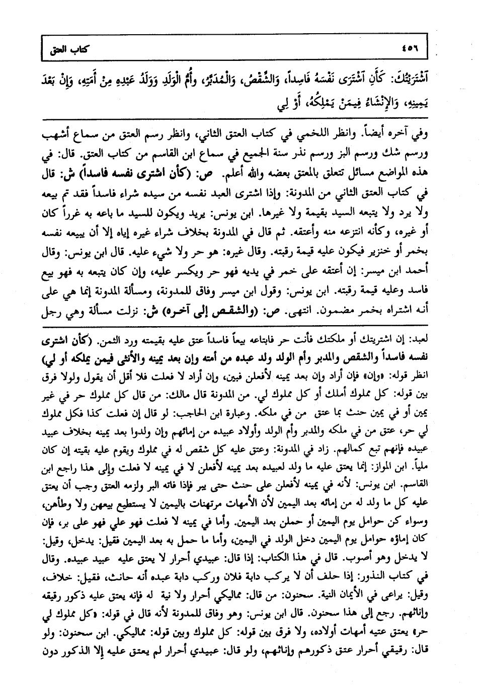 وفي آخره أيضا، وانظر اللخمي في كتاب العتق الثاني وانظر رسم العتق من سماع أشهب ورسم شك، ورسم نذر سنة، الجميع في سماع ابن القاسم من كتاب العتق قال: في هذه المواضع مسائل تتعلق بالمعتق بعضه، والله أعلم. ص: (كان اشترى نفسه فاسدا) ش: قال في كتاب العتق الثاني من المدونة: وإذا اشترى العبد نفسه من سيده شراء فاسدا فقد تم بيعه ولا يرد ولا يتبعه السيد بقيمة ولا غيرها ابن يونس يريد ويكون للسيد ما باعه به غررا كان أو غيره وكأنه انتزعه منه وأعتقه، ثم قال في المدونة: بخلاف شراء غيره إياه إلا أن يبيعه نفسه بخمر أو خنزير فيكون عليه قيمة رقبته، وقال غيره: هو حر ولا شيء عليه، قال ابن يونس": وقال أحمد بن ميسر: إن أعتقه على خمر في يديه فهو حر ويكسر عليه، وإن كان يتبعه فهو بيع فاسد وعليه قيمة رقبته، ابن يونس: وقول ابن ميسر وفاقا للمدونة ومسألة المدونة: إنما هي على أنه اشتراه بخمر مضمون انتهى. ص:(والشقص: إلى آخره) ش: نزلت مسألة وهي رجل