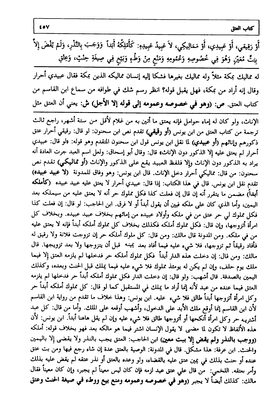 أو رقيقي، أوعبيدي، أو مماليكي، لا عبيد عبيده، كأملكه أبداً، ووجبت بالنذر ولم يقض إلا ببت معين، وهو في خصوصه وعمومه منع من وطء، وبيع في صيغة حنث وعتق،