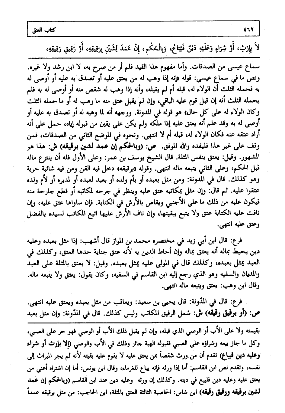 سماع عيسى من الصدقات وأما مفهوم هذا القيد فلم أر من صرح به لا ابن رشد ولا غيره، ونص ما في سماع عيسى قوله: إنه إذا وهب له من يعتق عليه أو تصدق به عليه أو أوصى له به، فحمله الثلث أن الولاء له قبله أم لم يقبله، وأنه إذا وهب له شقص منه أو أوصى له به فلم يحمله الثلث أنه إن قبل قوم عليه الباقي، وإن لم يقبل عتق منه ما وهب له أو ما حمله الثلث، وكان الولاء له على كل حال، هو قوله في المدونة ووجهه أنه لما وهبه له أو تصدق به عليه أو أوصى له به وقد علم أنه يعتق عليه إذا ملكه ولم يكن على يقين من قبوله إياه حمل على أنه أراد عتقه عنه فكان الولاء له قبله أم لا انتهى. ونحوه في الموضع الثاني من الصدقات فمن وقف على غير هذا فليفده، والله الموفق. ص: (وبالحكم إن عمد لشين برقيقه) ش: هذا هو المشهور وقيل: يعتق بنفس المثلة، قال الشيخ يوسف بن عمر: وعلى الأول فله أن ينتزع ماله قبل الحكم، وعلى الثاني يتبعه ماله انتهى. وقوله: "برقيقه" دخل فيه القن ومن فيه شائبة حرية، وهو كذلك قال في المدونة: ومن مثل بعبده أو بأم ولده أو بعبد لعبده أو لمدبره أو لأم ولده عتقوا عليه، ثم قال: وإن مثل بمكاتبه عتق عليه، وينظر في جرحه لمكاتبه أو قطع جارحة منه فيكون عليه من ذلك ما على الأجنبي، ويقاص بالأرش في الكتابة فإن ساواها عتق عليه، وإن نافت عليه الكتابة عتق ولا يتبع ببقيتها، وإن ناف الأرش عليها أتبع المكاتب لسيده بالفضل، وعتق عليه انتهى.