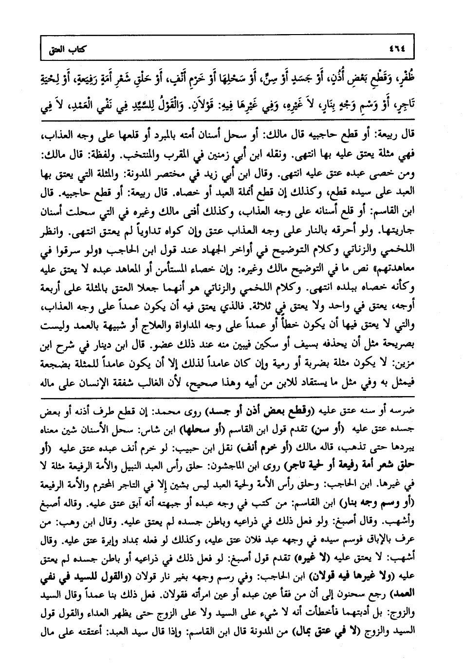 قال ربيعة: أو قطع حاجبيه قال مالك: أو سحل أسنان أمته بالمبرد أو قلعها على وجه العذاب فهي مثلة يعتق عليه بها انتهى. ونقله ابن أبي زمنين في المقرب والمنتخب، ولفظه قال مالك: "ومن خصى عبده عتق عليه" انتهى. وقال ابن أبي زيد في مختصر المدونة: والمثلة التي يعتق بها العبد على سيده قطع وكذلك إن قطع أنملة العبد أو خصاه قال ربيعة: أو قطع حاجبيه قال ابن القاسم: أو قلع أسنانه على وجه العذاب وكذلك أفتى مالك وغيره في التي سحلت أسنان جاريتها ولو أحرقه بالنار على وجه العذاب عتق، وإن كواه تداويا لم يعتق انتهى. وانظر اللخمي والزناتي وكلام التوضيح في أواخر الجهاد عند قول ابن الحاجب ولو سرقوا في معاهدتهم نص ما في التوضيح مالك وغيره، وإن خصاء المستأمن أو المعاهد عبده لا يعتق عليه وكأنه خصاه ببلده انتهى. وكلام اللخمي والزناتي هو أنهما جعلا العتق بالمثلة على أربعة أوجه: يعتق في واحد ولا يعتق في ثلاثة فالذي يعتق فيه أن يكون عمدا على وجه العذاب والتي لا يعتق فيها أن يكون خطأ أو عمدا على وجه المداواة والعلاج أو شبيهة بالعمد، وليست بصريحة مثل أن يحذفه بسيف أو سكين فيبين منه عند ذلك عضو قال ابن دينار في شرح ابن مزين: لا يكون مثلة بضربة أو رمية، وإن كان عامدا لذلك إلا أن يكون عامدا للمثلة بضجعة فيمثل به، وفي مثل ما يستقاد للابن من أبيه وهذا صحيح؛ لأن الغالب شفقة الإنسان على ماله