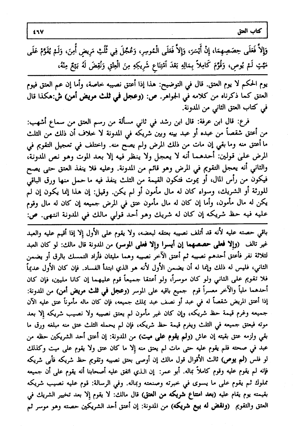 فرع: قال ابن عرفة: قال ابن رشد في ثاني مسألة من رسم العتق من سماع أشهب: من أعتق شقصا من عبده أو عبد بينه وبين شريكه في المدونة: لا خلاف أن ذلك من الثلث ما أعتق منه وما بقي إن مات من ذلك المرض ولم يصح منه واختلف في تعجيل التقويم في المرض على قولين أحدهما أنه لا يعجل، ولا ينظر فيه إلا بعد الموت وهو نص المدونة، والثاني أنه يعجل التقويم في المرض، وهو قائم من المدونة وعليه فلا ينفذ العتق حتى يصح فيكون من رأس المال أو يموت فتكون القيمة من الثلث ينفذ فيه ما حمل منها ورق الباقي للورثة أو الشريك وسواء كان له مال مأمون أو لم يكن وقيل إن هذا إنما يكون إن لم يكن له مال مأمون وأما إن كان له مال مأمون عتق في المرض جميعه إن كان له مال، وقوم عليه فيه حظ شريكه إن كان له شريك، وهو أحد قولي مالك في المدونة انتهى. ص: