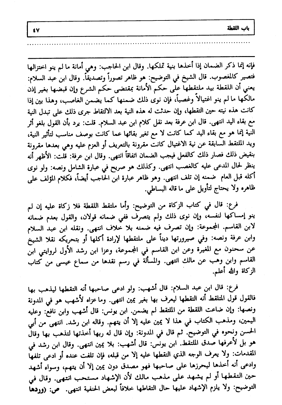 فرع: قَالَ فِي كِتَابِ الزَّكَاةِ مِنْ التَّوْضِيحِ: وَأَمَّا مُلْتَقِطُ اللُّقَطَةِ فَلَا زَكَاةَ عَلَيْهِ إنْ لَمْ يَنْوِ إمْسَاكَهَا لِنَفْسِهِ وَإِنْ نَوَى ذَلِكَ وَلَمْ يَتَصَرَّفْ فَفِي ضَمَانِهِ قَوْلَانِ، وَالْقَوْلُ بِعَدَمِ ضَمَانِهِ لِابْنِ الْقَاسِمِ. الْمَجْمُوعَةُ: وَإِنْ تَصَرَّفَ فِيهِ ضَمِنَهُ بِلَا خِلَافٍ، انْتَهَى. وَنَقَلَهُ ابْنُ عَبْدِ السَّلَامِ وَابْنُ عَرَفَةَ وَنَصُّهُ: وَفِي صَيْرُورَتِهَا دَيْنًا عَلَى مُلْتَقِطِهَا لِإِرَادَةِ أَكْلِهَا أَوْ بِتَحْرِيكِهِ نَقْلَا الشَّيْخِ عَنْ سَحْنُونٍ مَعَ الْمُغِيرَةِ وَعَنْ ابْنِ الْقَاسِمِ فِي الْمَجْمُوعَةِ وَعَزَا ابْنُ رُشْدٍ الْأَوَّلَ لِرِوَايَتَيْ ابْنِ الْقَاسِمِ وَابْنُ وَهْبٍ عَنْ مَالِكٍ، انْتَهَى. وَالْمَسْأَلَةُ فِي رَسْمِ نَقَدَهَا مِنْ سَمَاعِ عِيسَى مِنْ كِتَابِ الزَّكَاةِ، وَاَللَّهُ أَعْلَمُ.