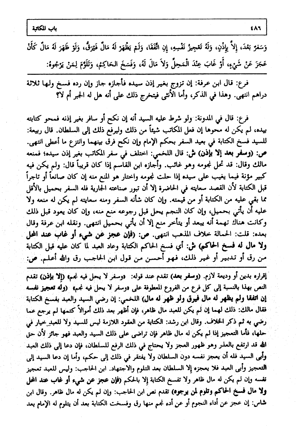 ص: (وسفر بعد إلا بإذن) ش: قال اللخمي: اختلف في سفر المكاتب بغير إذن سيده فمنعه مالك، وقال: قد تحل نجومه وهو غائب وأجازه ابن القاسم إذا كان قريبا، قال: ولم يكن فيه كبير مؤنة فيما يغيب على سيده إذا حلت نجومه، واختار هو المنع منه إن كان صانعا أو تاجرا قبل الكتابة؛ لأن القصد سعايته في الحاضرة إلا أن تبور صناعته الجارية فله السفر بحميل بالأقل مما بقي عليه من الكتابة أو من قيمته، وإن كان شأنه السفر ومنه سعايته لم يكن له منعه ولا عليه أن يأتي بحميل، وإن كان النجم يحل قبل رجوعه منع منه، وإن كان يعود قبل ذلك وكانت هناك تهمة أنه يبعد أو يتأخر منع إلا أن يأتي بحميل انتهى. ونقله ابن عرفة، وقال بعده قلت الحمالة خلاف المذهب انتهى.