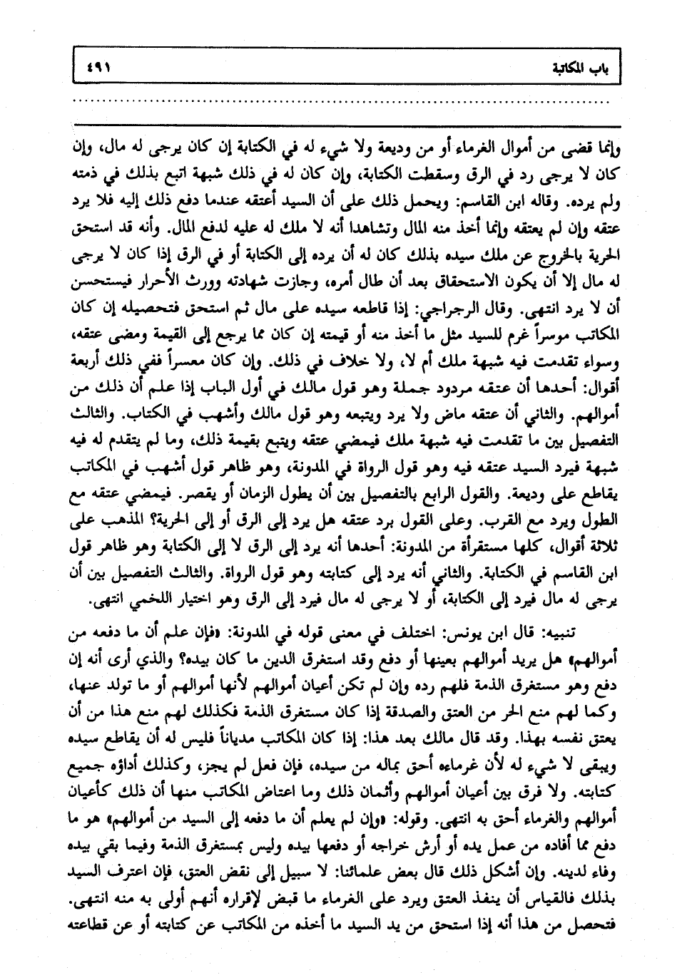 وإنما قضى من أموال الغرماء أو من وديعة ولا شيء له في الكتابة إن كان يرجى له مال، وإن كان لا يرجى رد في الرق وسقطت الكتابة، وإن كان له في ذلك شبهة اتبع بذلك في ذمته ولم يرده، وقاله ابن القاسم ويحمل ذلك على أن السيد أعتقه عندما دفع ذلك إليه فلا يرد عتقه، وإن لم يعتقه، وإنما أخذ منه المال، وتشاهدا أنه لا ملك له عليه لدفع المال، وأنه قد استحق الحرية بالخروج عن ملك سيده بذلك كان له أن يرده إلى الكتابة أو في الرق إذا كان لا يرجى له مال إلا أن يكون الاستحقاق بعد أن طال أمره وجازت شهادته وورث الأحرار فيستحسن أن لا يرد انتهى. وقال الرجراجي: إذا قاطعه سيده على مال، ثم استحق فتحصيله إن كان المكاتب موسرا غرم للسيد مثل ما أخذ منه أو قيمته إن كان مما يرجع إلى القيمة ومضى عتقه وسواء تقدمت فيه شبهة ملك أم لا ولا خلاف في ذلك، وإن كان معسرا، ففي ذلك أربعة أقوال: أحدها: أن عتقه مردود جملة، وهو قول مالك في أول الباب إذا علم أن ذلك من أموالهم، والثاني: أن عتقه ماض ولا يرد ويتبعه، وهو قول مالك وأشهب في الكتاب، والثالث: التفصيل بين ما تقدمت فيه شبهة ملك فيمضي عتقه ويتبع بقيمة ذلك وما لم يتقدم له فيه شبهة فيرد السيد عتقه فيه، وهو قول الرواة في المدونة، وهو ظاهر قول أشهب في المكاتب يقاطع على وديعة، والقول الرابع بالتفصيل بين أن يطول الزمان أو يقصر فيمضي عتقه مع الطول ويرد مع القرب، وعلى القول برد عتقه هل يرد إلى الرق أو إلى الحرية؟ المذهب على ثلاثة أقوال كلها مستقرأة من المدونة أحدها: أنه يرد إلى الرق لا إلى الكتابة، وهو ظاهر قول ابن القاسم في الكتابة، والثاني: أنه يرد إلى كتابته، وهو قول الرواة، والثالث: التفصيل بين أن يرجى له مال فيرد إلى الكتابة أو لا يرجى له مال فيرد إلى الرق، وهو اختيار اللخمي انتهى.