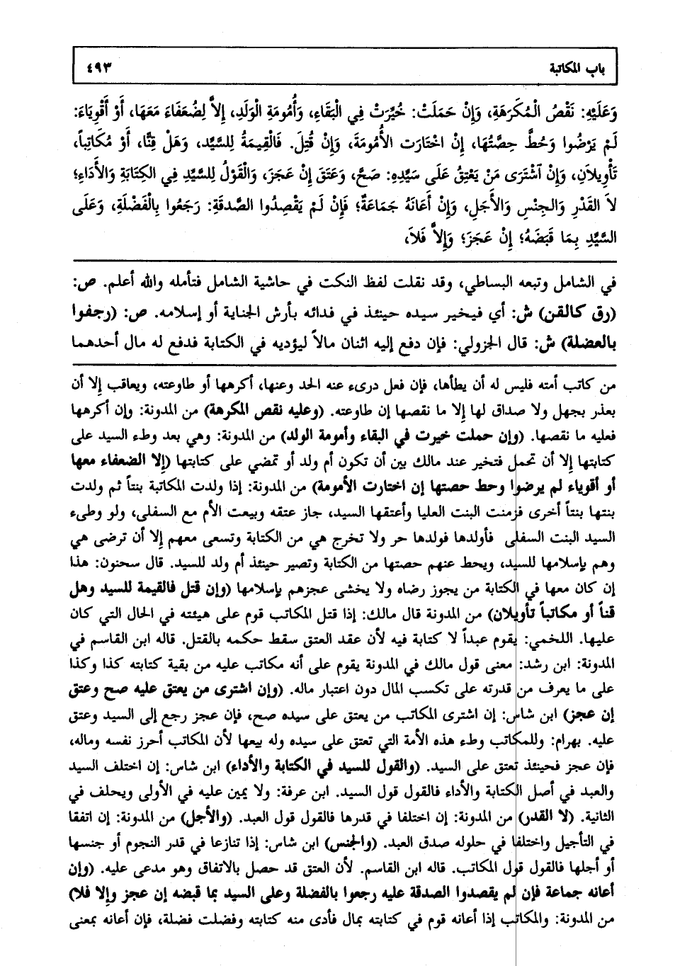 وعليه نقص المكرهة، وإن حملت خيرت في البقاء وأمومة الولد، إلا لضعفاء معها أو أقوياء لم يرضوا، وحط حصتها إن اختارت الأمومة وإن قتل فالقيمة للسيد، وهل قناً أو مكاتباً؟ تأويلان، وإن اشترى من يعتق على سيده صح وعتق إن عجز، والقول للسيد في الكتابة والأداء لا القدر والجنس، والأجل وإن أعانه جماعة فإن لم يقصدوا الصدقة رجعوا بالفضلة، وعلى السيد بما قبضه إن عجز وإلا فلا،