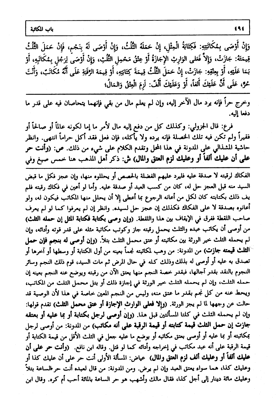 وإن أوصى بمكاتبته فكتابة المثل، إن حمله الثلث وإن أوصى له بنجم، فإن حمل الثلث قيمته جازت، وإلا فعلى الوارث الإجازة أو عتق محمل الثلث، وإن أوصى لرجل بمكاتبة أو بما عليه أو بعتقه جازت، إن حمل الثلث قيمة كتابته، أو قيمة الرقبة على أنه مكاتب، وأنت حر على أن عليك ألفاً أو وعليك ألف لزم العتق والمال