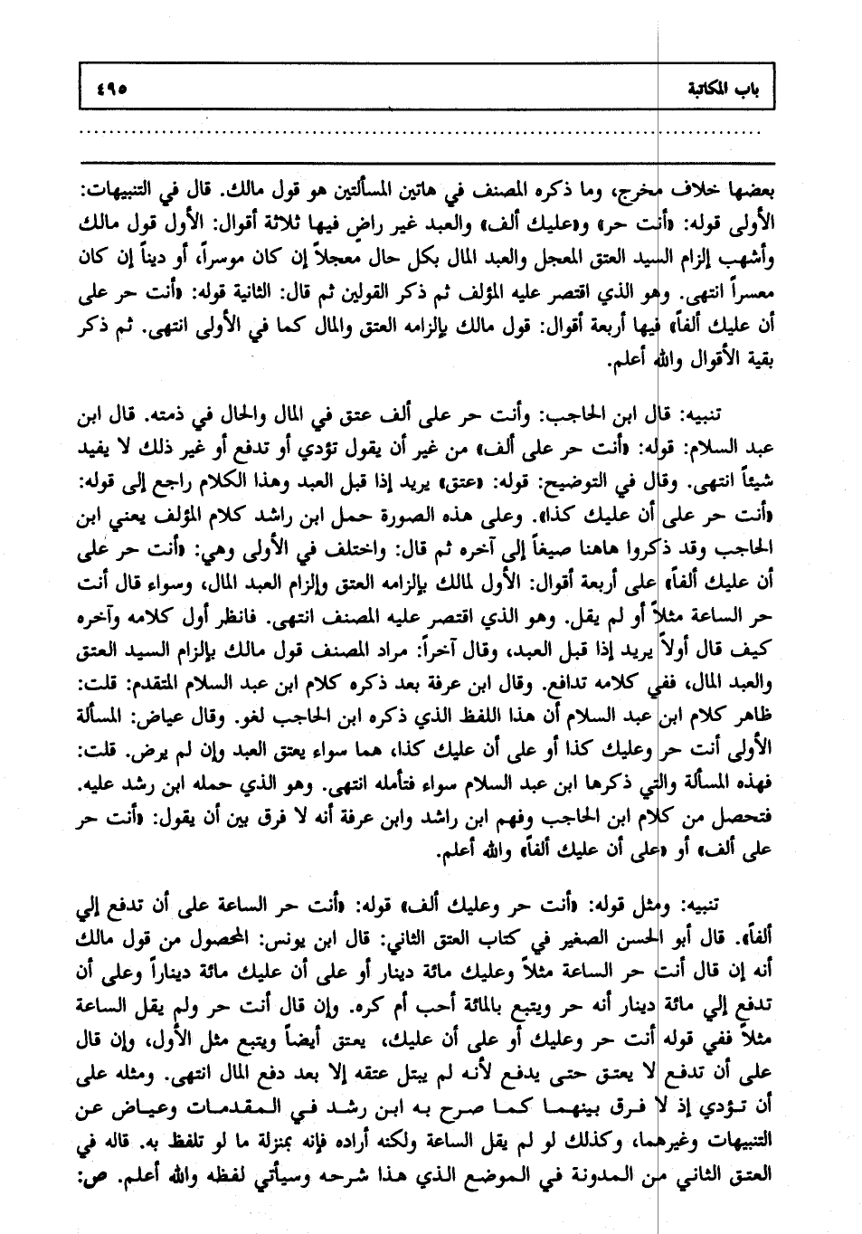 تنبيه: قال ابن الحاجب: وأنت حر على ألف عتق في المال والحال في ذمته، قال ابن عبد السلام: قوله: "أنت حر على ألف" من غير أن يقول تؤدي أو تدفع أو غير ذلك لا يفيد شيئا انتهى. وقال في التوضيح: قوله: "عتق" يريد إذا قبل العبد، وهذا الكلام راجع إلى قوله:"أنت حر على أن عليك كذا" وعلى هذه الصورة حمل ابن راشد كلام المؤلف يعني ابن الحاجب وقد ذكروا ههنا صيغا إلى آخره، ثم قال: واختلف في الأولى وهي أنت حر على أن عليك ألفا على أربعة أقوال: الأول لمالك بإلزامه العتق وإلزام العبد المال وسواء قال: أنت حر الساعة مثلا أو لم يقل، وهو الذي اقتصر عليه المصنف انتهى. فانظر أول كلامه وآخره كيف قال: أولا يريد إذا قبل العبد، وقال آخرا: مراد المصنف قول مالك بإلزام السيد العتق، والعبد المال ففي كلامه تدافع، وقال ابن عرفة بعد ذكره كلام ابن عبد السلام المتقدم: قلت: ظاهر كلام ابن عبد السلام أن هذا اللفظ الذي ذكره ابن الحاجب لغو، وقال عياض: المسألة الأولى أنت حر وعليك كذا أو على أن عليك كذا هما سواء يعتق العبد، وإن لم يرض قلت: فهذه المسألة والتي ذكرها ابن عبد السلام سواء فتأمله انتهى. وهو الذي حمله ابن رشد عليه فتحصل من كلام ابن الحاجب وفهم ابن راشد وابن عرفة أنه لا فرق بين أن يقول أنت حر على ألف أو على أن عليك ألفا، والله أعلم.