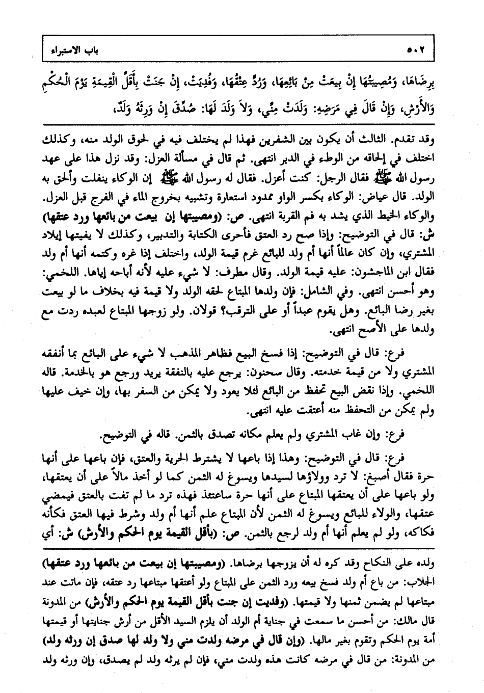 برضا ها ومصيبتها إن عتقت من بائعها ورد عتقها وفديت، إن جنت بأقل القيمة يوم الحكم، والأرش وإن قال في مرضه: ولدت مني ولا ولد لها صدق إن ورثه ولد