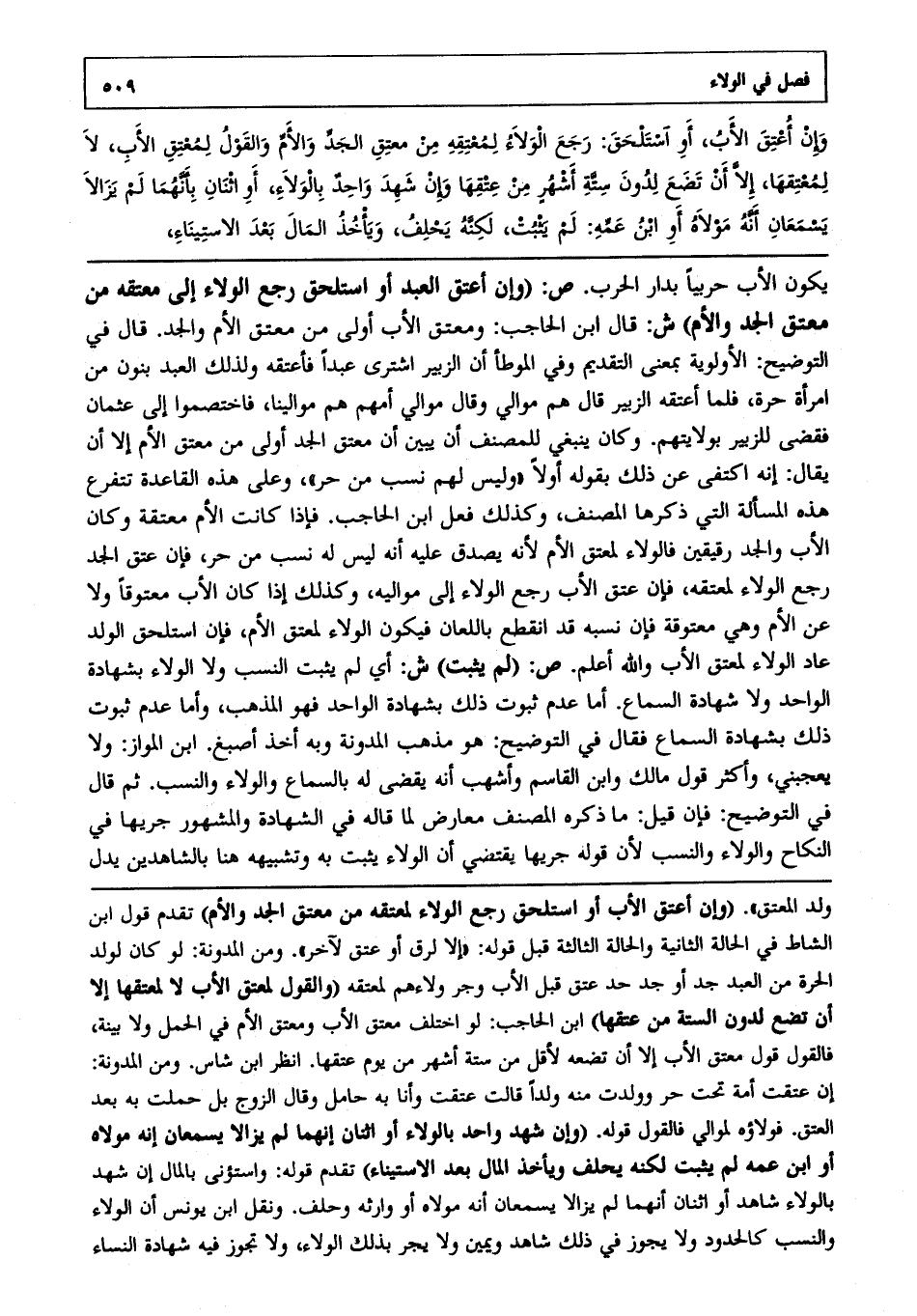 يكون الأب حربيا بدار الحرب. ص: (وإن أعتق العبد أو استلحق رجع الولاء إلى معتقه من معتق الجد والأم) ش: قال ابن الحاجب: ومعتق الأب أولى من معتق الأم والجد قال في التوضيح: الأولوية بمعنى التقديم، وفي الموطإ أن الزبير اشترى عبدا فأعتقه ولذلك العبد بنون من امرأة حرة فلما أعتقه الزبير قال: هم موالي، وقال: موالي أمهم هم موالينا فاختصموا إلى عثمان فقضى للزبير بولايتهم وكان ينبغي للمصنف أن يبين أن معتق الجد أولى من معتق الأم إلا أن يقال: إنه اكتفى عن ذلك بقوله أولا وليس لهم نسب من حر وعلى هذه القاعدة تتفرع هذه المسألة التي ذكرها المصنف وكذلك فعل ابن الحاجب فإذا كانت الأم معتقة وكان الأب والجد رقيقين فالولاء لمعتق الأم؛ لأنه يصدق عليه أنه ليس له نسب من حر فإن عتق الجد رجع الولاء لمعتقه فإن عتق الأب رجع الولاء إلى مواليه وكذلك إذا كان الأب معتوقا ولاعن الأم وهي معتوقة فإن نسبه قد انقطع باللعان فيكون الولاء لمعتق الأم فإن استلحق الولد عاد الولاء لمعتق الأب، والله أعلم. ص: (لم يثبت) ش: أي لم يثبت النسب ولا الولاء بشهادة الواحد ولا شهادة السماع أما عدم ثبوت ذلك بشهادة الواحد فهو المذهب وأما عدم ثبوت ذلك بشهادة السماع فقال في التوضيح: هو مذهب المدونة وبه أخذ أصبغ ابن المواز ولا يعجبني، وأكثر قول مالك وابن القاسم، وأشهب أنه يقضي له بالسماع، والولاء والنسب، ثم قال في التوضيح: فإن قيل ما ذكره المصنف معارض لما قاله في الشهادة والمشهور جريها في النكاح والولاء والنسب؛ لأن قوله: "جريها" يقتضي أن الولاء يثبت به وتشبيهه هنا بالشاهدين يدل