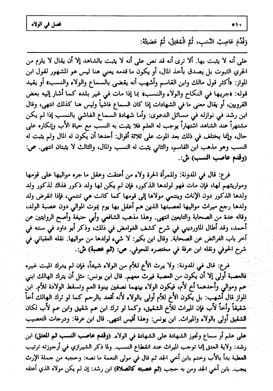 على أنه لا يثبت بها ألا ترى أنه قد نص على أنه لا يثبت بالشاهد إلا أن يقال: لا يلزم من الجري الثبوت بل يصدق بأخذ المال أو يكون ما قدمه يعني هنا ليس هو المشهور؛ لقول ابن المواز: أكثر قول مالك وابن القاسم وأشهب أنه يقضي بالسماع، والولاء، والنسب ، أو يقيد قوله: "جريها في النكاح، والولاء، والنسب" بما إذا مات في غير بلده كما أشار إليه بعض القرويين أو يقال: معنى ما في الشهادات إذا كان السماع فاشيا وليس هنا كذلك انتهى. وقال ابن رشد في نوازله في مسائل الدعوى: وأما شهادة السماع الفاشي بالنسب إذا لم يكن مشتهرا عند الشاهد اشتهارا يوجب له العلم، فلا يثبت به النسب مع حياة الأب، وإنكاره على حال، وإنما يختلف في ذلك بعد الموت على ثلاثة أقوال: أحدها: أن يكون له المال ولم يثبت له النسب، وهو مذهب ابن القاسم، والثاني: يثبت له النسب والمال، والثالث: لا يثبتان انتهى. ص: (وقدم عاصب النسب) ش: