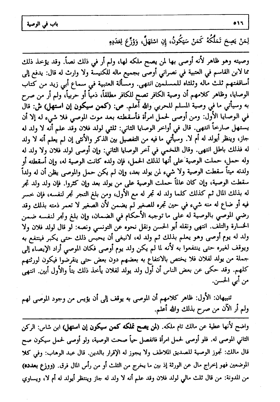 ص: (كمن سيكون إن استهل) ش: قال في الوصايا الأول: ومن أوصى لحمل امرأة فأسقطته بعد موت الموصي فلا شيء له إلا أن يستهل صارخا انتهى. قال في أواخر الوصايا الثاني: ثلثي لولد فلان، وقد علم أنه لا ولد له جاز، وينظر أيولد له أم لا؟ وسيأتي ما فيه من التفصيل بين الذكر والأنثى إن لم يعلم أنه لا ولد له فذلك باطل انتهى. وقال اللخمي في آخر الوصايا الثاني: وإن أوصى لولد فلان ولا ولد وله حمل حملت الوصية على أنها لذلك الحمل فإن ولدته كانت الوصية له، وإن أسقطته أو ولدته ميتا سقطت الوصية، ولا شيء لمن يولد بعد، وإن لم يكن حمل، والموصي يظن أن له ولدا سقطت الوصية، وإن كان عالما حملت الوصية على من يولد بعد، وإن كثروا فإن ولد ولد تجر له بذلك المال، ثم كذلك كلما ولد له ولد تجر له مع الأول، ومن بلغ التجر تجر لنفسه فإن خسر فيه أو ضاع له منه شيء في حين تجره للصغير لم يضمن؛ لأن الصغير لا تعمر ذمته بذلك وقد رضي الموصي بالوصية له على ما توجبه الأحكام في الضمان، وإن بلغ وتجر لنفسه ضمن الخسارة والتلف انتهى. ونقله أبو الحسن ونقل نحوه عن التونسي، ونصه: لو قال لولد فلان ولا ولد له يوم أوصى، وهو يعلم بذلك، ثم ولد له لا نبغ أن يحبس ذلك حتى يكبر فينتفع به ويوقف لغيره حتى ينتفعوا به؛ لأنه لما لم يكن ولد يوم أوصى فكأن الموصي أراد الإيصاء إلى جملة من يولد لفلان فلا يختص: بالانتفاع به بعضهم دون بعض حتى ينقرضوا فيكون لورثتهم كلهم، وقد حكي عن بعض الناس أن أول ولد يولد لفلان يأخذ ذلك بتا، والأول أبين انتهى. من أبي الحسن.