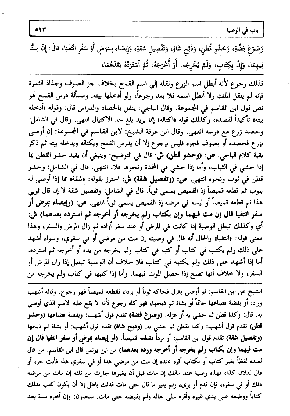 فذلك رجوع؛ لأنه أبطل اسم الزرع، ونقله إلى اسم القمح بخلاف جز الصوف وجذاذ الثمرة فإنه لم ينقل الملك ولا أبطل اسمه فلا يعد رجوعا ولو أدخلها بيته، ومسألة درس القمح هو نص قول ابن القاسم في المجموعة: وقال الباجي: ينقل بالحصاد والدراس قال: وقوله: "أدخله بيته" تأكيدا لقصده وكذلك قوله: "اكتاله" إنما يريد بلغ حد الاكتيال انتهى، وقال في الشامل: وحصد زرع مع درسه انتهى. وقال ابن عرفة: الشيخ لابن القاسم في المجموعة: إن أوصى بزرع فحصده، أو بصوف فجزه فليس برجوع إلا أن يدرس القمح ويكتاله ويدخله بيته، ثم ذكر بقية كلام الباجي. ص: (وحشو قطن) ش: قال في التوضيح: وينبغي أن يقيد حشو القطن بما إذا حشي في الثياب، وأما إذا حشي في المخدة ونحوها فلا انتهى. قال في الشامل: وحشو قطن في ثوب، ونحوه انتهى. ص: (وتفصيل شقة) ش: احترز بقوله: "شقة" مما إذا أوصى له بثوب، ثم قطعه قميصا إذ القميص يسمى ثوبا، قال في الشامل: وتفصيل شقة لا إن قال: ثوبي هذا، ثم قطعه قميصا أو لبسه في مرضه إذ القميص يسمى ثوبا انتهى. ص: (وإيصاء بمرض أو سفر انتفيا قال: إن مت فيهما، وإن بكتاب ولم يخرجه أو أخرجه، ثم استرده بعدهما) ش: أي وكذلك تبطل الوصية إذا كانت في المرض أو عند سفر أراده، ثم زال المرض والسفر، وهذا معنى قوله: "انتفيا" والحال أنه قال في وصيته: إن مت من مرضي، أو في سفري وسواء أشهد على ذلك، ولم يكتب في كتاب أو كتبه في كتاب ولم يخرجه من يده أو أخرجه، ثم استرده أما إذا أشهد على ذلك ولم يكتبه في كتاب فلا خلاف أن الوصية تبطل إذا زال المرض أو السفر، ولا خلاف أنها تصح إذا حصل الموت فيهما وأما إذا كتبها في كتاب ولم يخرجه من