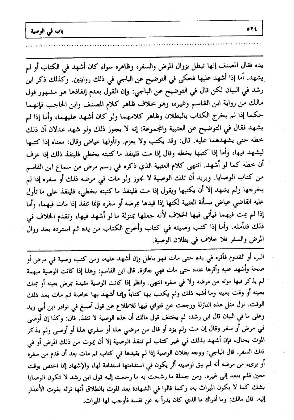 يده، فقال المصنف: إنها تبطل بزوال المرض والسفر وظاهره سواء كان أشهد في الكتاب أو لم يشهد أما إذا أشهد عليها، فحكى في التوضيح عن الباجي في ذلك روايتين وكذلك ذكر ابن رشد في البيان لكن قال في التوضيح عن الباجي، وأن القول بعدم إنفاذها هو مشهور قول مالك من رواية ابن القاسم وغيره، وهو خلاف ظاهر كلام المصنف وابن الحاجب فإنهما حكما إذا لم يخرج الكتاب بالبطلان، وظاهر كلامهما ولو كان أشهد عليهما وأما إذا لم يشهد، فقال في التوضيح عن العتبية والمجموعة إنه لا يجوز ذلك ولو شهد عدلان أن ذلك خطه حتى يشهدهما عليه، قال: وقد يكتب ولا يغرم وتأولها عياض، وقال: معناه إذا كتبها ليشهد فيها وأما إذا كتبها بخطه، وقال: إذا مت فلينفذ ما كتبته بخطي فلينفذ ذلك إذا عرف أنه خطه كما لو أشهد انتهى. كلام العتبية الذي ذكره في رسم مرض من سماع ابن القاسم من كتاب الوصايا ويريد أن تلك الوصية لا تجوز ولو مات في مرضه ذلك أو سفره إذا لم يخرجها، ولم يشهد إلا أن يكتبها، ويقول: إذا مت فلينفذ ما كتبته بخطي فلينفذ على ما تأول عليه القاضي عياض مسألة العتبية لكنها إذا قيدها بمرضه أو سفره فإنما تنفذ إذا مات فيهما، وأما إذا لم يمت فيهما فيأتي فيها الخلاف؛ لأنه جعلها بمنزلة ما لو أشهد فيها وتقدم الخلاف في ذلك فتأمله، وأما إذا كتب وصيته في كتاب، وأخرج الكتاب من يده، ثم استرده بعد زوال المرض والسفر فلا خلاف في بطلان الوصية.