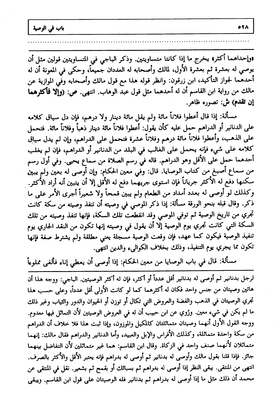 مسألة: إذا ذكر الموصي في وصيته أن تنفذ وصيته من سكة كانت تجري من تاريخ الوصية ثم توفي الموصي وقد انقطعت تلك السكة فإنها تنفذ وصيته من تلك السكة التي كانت تجري يوم الوصية إلا أن يقول في وصيته: إنها تكون من النقد الجاري يوم تنفيذ الوصية فيكون كما عهد فإن وقعت الوصية مسجلة يعني مطلقة ولم يشترط صفة فإنها تكون مما يجري يوم التنفيذ وذلك بخلاف الكوالئ والدين انتهى.