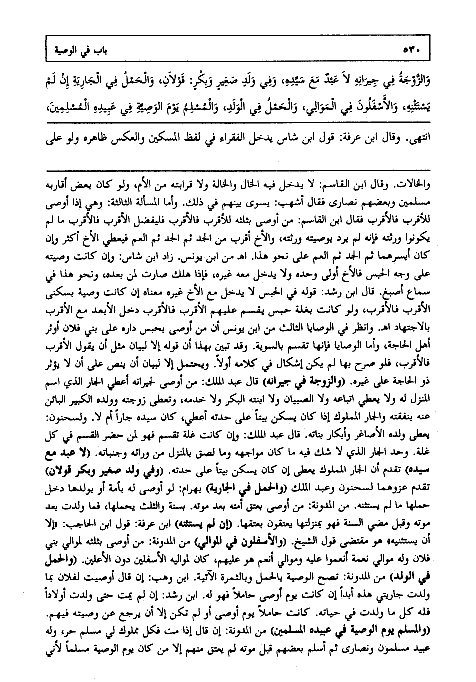 والزوجة في جيرانه، لا عبد مع سيده، وفي ولد صغير وبكر قولان، والحمل في الجارية إن لم يستثنه، والأسفلون في الموالي، والحمل في الولد، والمسلم يوم الوصية في عبيده المسلمين،