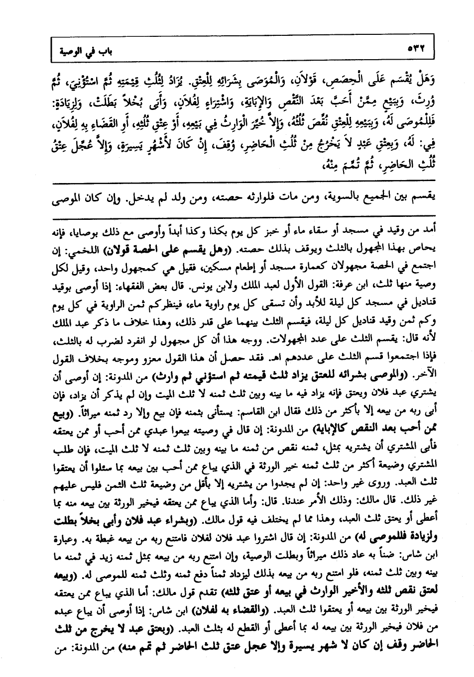 وهل يقسم على الحصص؟ قولان، والموصى بشرائه للعتق يزاد لثلث قيمته ثم استؤني، ثم ورث وببيع ممن أحب بعد النقص والإبانة واشتراء من فلان وأتي بخلاً بطلت، والزيادة فللموصى له وببيعه للعتق نقص ثلثه، وإلا خير الوارث في بيعه، أو عتق ثلثه أو القضاء به لفلان في: له وبعتق عبد لايخرج من ثلث الحاضر وقف إن كان لأشهر يسيرة، وإلا أجل عتق ثلث الحاضر ثم تمم منه