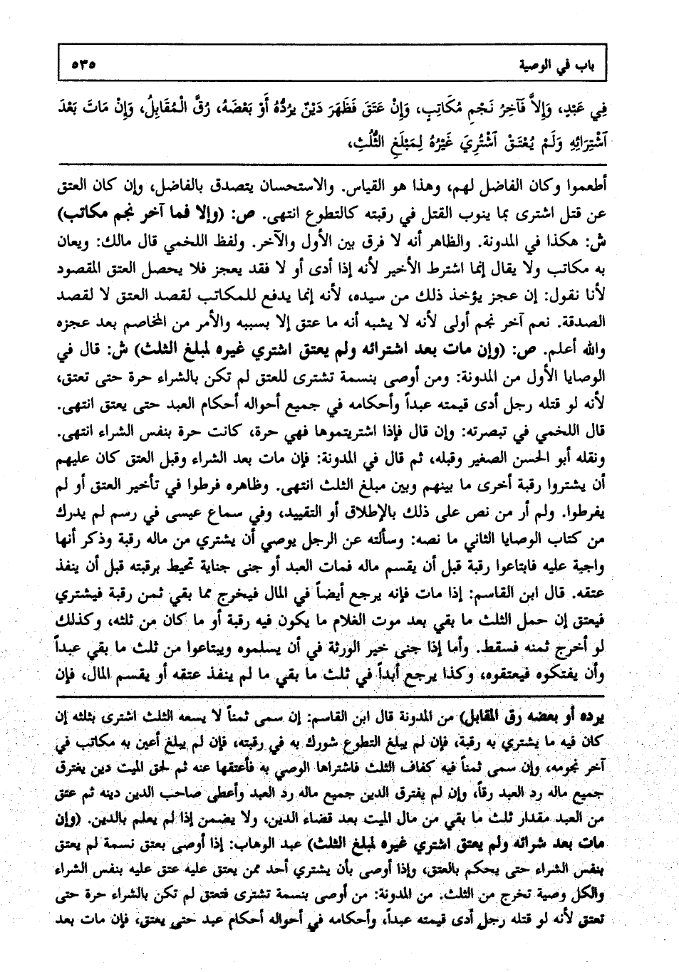 أطعموا وكان الفاضل لهم وهذا هو القياس والاستحسان يتصدق بالفاضل، وإن كان العتق عن قتل اشترى بما ينوب القتل في رقبته كالتطوع انتهى. ص: (وإلا فآخر نجم مكاتب) ش: هكذا في المدونة والظاهر أنه لا فرق بين الأول والآخر، ولفظ اللخمي: قال مالك: ويعان مكاتب ولا يقال إنما اشترط الأخير؛ لأنه إذا أدى أولا فقد يعجز فلا يحصل العتق المقصود؛ لأنا نقول: إن عجز يؤخذ ذلك من سيده؛ لأنه إنما يدفع للمكاتب لقصد العتق لا لقصد الصدقة نعم آخر نجم أولى؛ لأنه لا يشبه أنه ما عتق إلا بسببه والأمر من المخاصم بعد عجزه، والله أعلم. ص: (وإن مات بعد اشترائه ولم يعتق اشترى غيره لمبلغ الثلث) ش: قال في الوصايا الأول من المدونة: ومن أوصى بنسمة تشترى للعتق لم تكن بالشراء حرة حتى تعتق؛ لأنه لو قتله رجل أدى قيمته عبدا وأحكامه في جميع أحواله أحكام العبد حتى يعتق انتهى. قال اللخمي في تبصرته: وإن قال: فإذا اشتريتموها فهي حرة كانت حرة بنفس الشراء انتهى، ونقله أبو الحسن الصغير وقبله ثم قال في المدونة: فإن مات بعد الشراء وقبل العتق كان عليهم أن يشتروا رقبة أخرى ما بينهم وبين مبلغ الثلث انتهى. وظاهره فرطوا في تأخير العتق أو لم يفرطوا، ولم أر من نص على ذلك بالإطلاق أو التقييد، وفي سماع عيسى في رسم لم يدرك من كتاب الوصايا الثاني ما نصه: وسألته عن الرجل يوصي أن يشترى من ماله رقبة وذكر أنها واجبة عليه فابتاعوا رقبة قبل أن يقسم ماله، فمات العبد أو جنى جناية تحيط برقبته قبل أن ينفذ عتقه، قال ابن القاسم: إذا مات فإنه يرجع أيضا في المال، فيخرج مما بقي ثمن رقبة فيشتري فيعتق إن حمل الثلث ما بقي بعد موت الغلام ما يكون فيه رقبة أو ما كان من ثلثه، وكذلك لو أخرج ثمنه فسقط وأما إذا جنى خير الورثة في أن يسلموا ويبتاعوا من ثلث ما بقي عبدا وأن يفتكوه فيعتقوه وكذا يرجع أبدا في ثلث ما بقي ما لم ينفذ عتقه أو يقسم المال، فإن