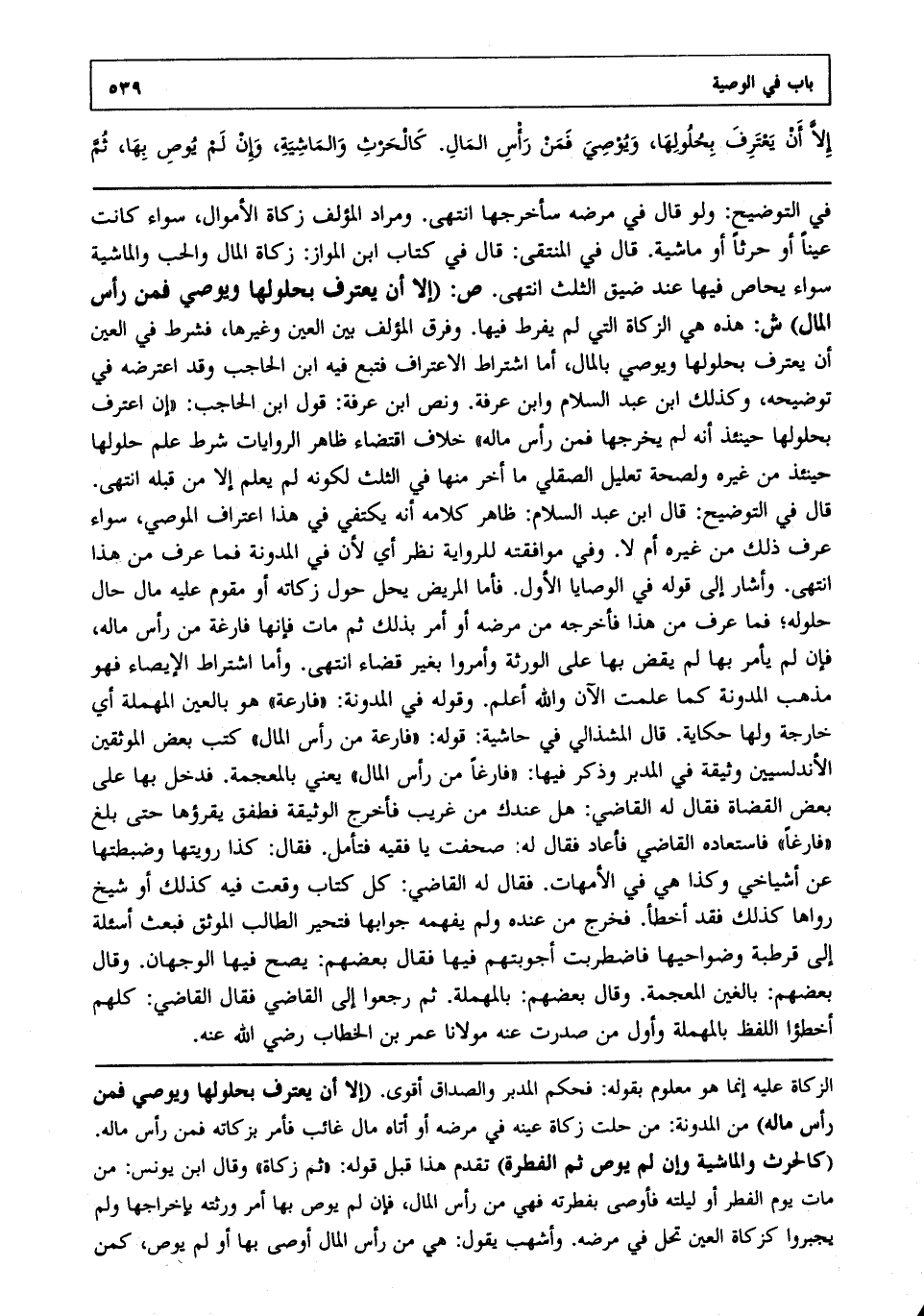 في التوضيح: ولو قال في مرضه: سأخرجها انتهى. ومراد المؤلف زكاة الأموال سواء كانت عينا أو حرثا أو ماشية، قال في المنتقى: قال في كتاب ابن المواز: زكاة المال والحب والماشية سواء يحاص فيها عند ضيق الثلث انتهى. ص: (إلا أن يعترف بحلولها، ويوصي فمن رأس المال) ش: هذه هي الزكاة التي لم يفرط فيها، وفرق المؤلف بين العين، وغيرها فشرط في العين أن يعترف بحلولها ويوصي بالمال أما اشتراط الاعتراف فتبع فيه ابن الحاجب وقد اعترضه في توضيحه وكذلك ابن عبد السلام وابن عرفة، ونص ابن عرفة قول ابن الحاجب إن اعترف بحلولها حينئذ أنه لم يخرجها فمن رأس ماله خلاف اقتضاء ظاهر الروايات، شرط علم حلولها حينئذ من غيره ولصحة تعليل الصقلي ما أخر منها في الثلث لكونه لم يعلم إلا من قبله انتهى. قال في التوضيح: قال ابن عبد السلام: ظاهر كلامه أنه يكتفى في هذا اعتراف الموصي سواء عرف ذلك من غيره أم لا، وفي موافقته للرواية نظر، أي لأن في المدونة فما عرف من هذا انتهى. وأشار إلى قوله في الوصايا الأول، فأما المريض يحل حول زكاته أو مقوم عليه مال حال حلوله فما عرف من هذا فأخرجه من مرضه أو أمر بذلك ثم مات فإنها فارغة من رأس ماله، فإن لم يأمر بها لم يقض بها على الورثة وأمروا بغير قضاء انتهى. وأما اشتراط الإيصاء فهو مذهب المدونة كما علمت الآن، والله أعلم. وقوله في المدونة: "فارعة" هو بالعين المهملة أي خارجة، ولها حكاية قال المشذالي في حاشية قوله: "فارعة من رأس المال" كتب بعض الموثقين الأندلسيين وثيقة في المدبر وذكر فيها: فارغا من رأس المال يعني بالمعجمة فدخل بها على بعض القضاة، فقال له القاضي: هل عندك من غريب؟ فأخرج الوثيقة فطفق يقرؤها حتى بلغ فارغا فاستعاده القاضي فأعاد، فقال له: صحفت يا فقيه، فتأمل، فقال: كذا رويتها وضبطتها عن أشياخي وكذا هي في الأمهات، فقال له القاضي: كل كتاب وقعت فيه كذلك أو شيخ رواها كذلك فقد أخطأ، فخرج من عنده ولم يفهمه جوابها، فتحير الطالب الموثق فبعث أسئلة إلى قرطبة وضواحيها فاضطربت أجوبتهم فيها، فقال بعضهم يصح فيها الوجهان، وقال بعضهم: بالغين المعجمة، وقال بعضهم بالمهملة ثم رجعوا إلى القاضي، فقال القاضي كلهم أخطئوا، واللفظة بالمهملة، وأول من صدرت عنه مولانا عمر بن الخطاب رضي الله تعالى عنه