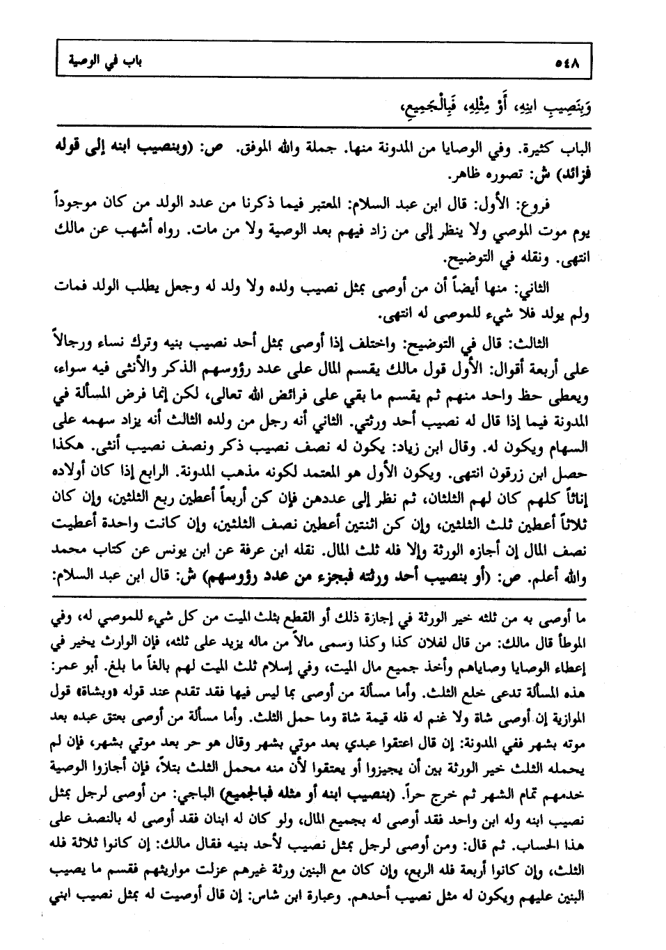 الثالث: قال في التوضيح واختلف إذا أوصى بمثل أحد نصيب بنيه وترك نساء ورجالا على أربعة أقوال: الأول: قول مالك يقسم المال على عدد رءوسهم الذكر والأنثى فيه سواء ويعطي حظ واحد منهم ثم يقسم ما بقي على فرائض الله تعالى لكن إنما فرض المسألة في المدونة فيما إذا قال له: نصيب أحد ورثتي،