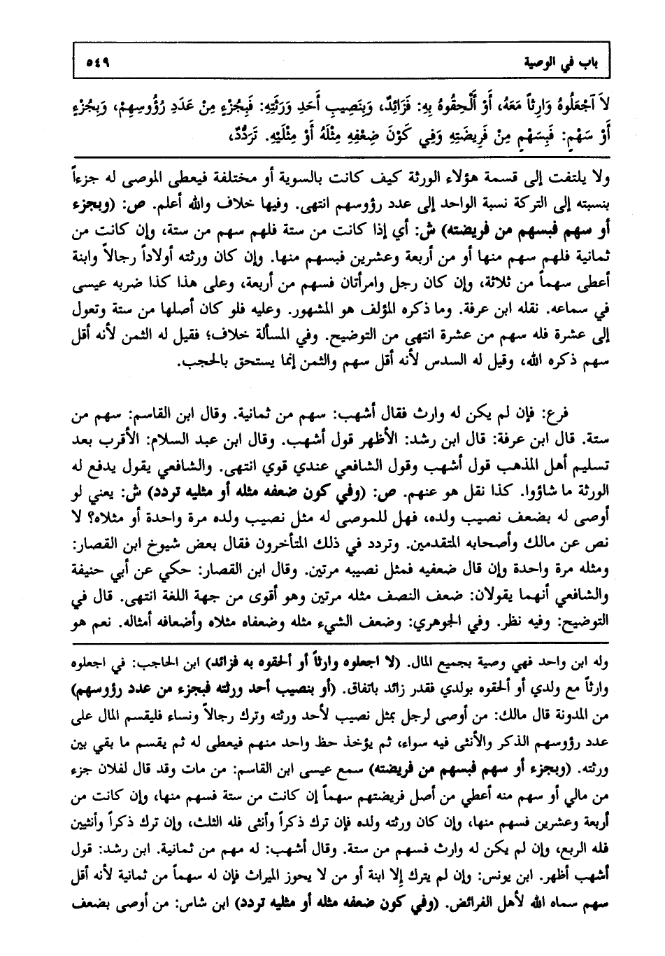 ولا يلتفت إلى قسمة هؤلاء الورثة كيف كانت بالسوية أو مختلفة فيعطى الموصى له جزءا بنسبته إلى التركة نسبة الواحد إلى عدد رءوسهم انتهى. وفيها خلاف، والله أعلم. ص: (وبجزء أو سهم فبسهم من فريضته) ش: أي إذا كانت من ستة فلهم سهم من ستة، وإن كانت من ثمانية فلهم سهم منها أو من أربعة وعشرين فبسهم منها، وإن كان ورثته أولادا رجالا، وابنة أعطي سهما من ثلاثة، وإن كان رجل وامرأتان فسهم من أربعة وعلى هذا كذا ضربه عيسى في سماعه، نقله ابن عرفة وما ذكره المؤلف هو المشهور وعليه فلو كان أصلها من ستة وتعول إلى عشرة فله سهم من عشرة انتهى. من التوضيح، وفي المسألة خلاف فقيل له الثمن؛ لأنه أقل سهم ذكره الله، وقيل له السدس؛ لأنه أقل سهم والثمن إنما يستحق بالحجب.