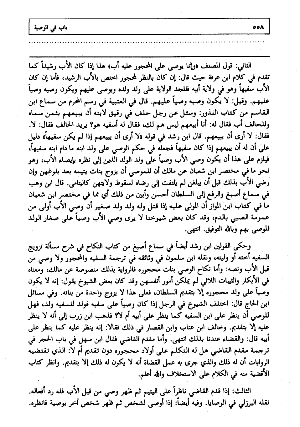 الثاني: قول المصنف: "وإنما يوصي على المحجور عليه أب" هذا إذا كان الأب رشيدا كما تقدم في كلام ابن عرفة حيث قال: إن كان بالنظر لمحجور اختص بالأب الرشيد فأما إن كان الأب سفيها وهو في ولاية أبيه فللجد الولاية على ولد ولده ويوصي عليهم، ويكون وصيه عليهم، وقيل لا يكون وصيه وصيا عليهم، قال في العتبية في رسم المحرم من سماع ابن القاسم من كتاب النذور: وسئل عن رجل حلف في رقيق لابنه أن يبيعهم بثمن سماه وللحالف أب فقال له: أنا أبيعهم ليس هم لك فقال له: أسفيه هو يريد الحالف؟ فقال: لا، فقال: لا أرى أن يبيعهم قال ابن رشد في قوله: "لا أرى أن يبيعهم إذا لم يكن سفيها" دليل على أن له أن يبيعهم إذا كان سفيها فجعله في حكم الوصي على ولد ابنه ما دام ابنه سفيها فيلزم على هذا أن يكون وصي الأب وصيا على ولد الولد الذين إلى نظره بإيصاء الأب وهو نحو ما في مختصر ابن شعبان عن مالك أن للموصى أن يزوج بنات يتيمه بعد بلوغهن، وإن رضي الأب بذلك قبل أن يبلغن لم يلتفت إلى رضاه لسقوط ولايتهن كاليتامى، قال ابن وهب في سماع أصبغ: والرفع إلى السلطان أحسن وأبين من ذلك أي مما في مختصر ابن شعبان ما في كتاب ابن المواز أن المولى عليه إذا قتل وله ولد ولد صغير أن وصي الأب أولى من عمومة الصبي بالدم، وقد كان بعض شيوخنا لا يرى وصي الأب وصيا على صغار الولد الموصى بهم وبالله التوفيق انتهى. وحكى القولين ابن رشد أيضا في سماع أصبغ من كتاب النكاح في شرح مسألة تزويج السفيه أخته أو وليته، ونقله ابن سلمون في وثائقه في ترجمة السفيه والمحجور ولا وصي من قبل الأب، ونصه: وأما نكاح الوصي بنات محجوره فالرواية بذلك منصوصة عن مالك ومعناه في الأبكار والثيبات اللائي لم يملكن أمور أنفسهن وقد كان بعض الشيوخ يقول: إنه لا يكون وصيا على ولد محجوره إلا بتقديم السلطان فعلى هذا لا يزوج واحدة من بناته، وفي مسائل ابن الحاج قال: اختلف الشيوخ في الرجل إذا كان وصيا على سفيه فولد للسفيه ولد فهل للوصي أن ينظر على ابن السفيه كما ينظر على أبيه أم لا؟ فذهب ابن زرب إلى أنه لا ينظر عليه إلا بتقديم. وخالف ابن عتاب وابن القصار في ذلك فقالا: إنه ينظر عليه كما ينظر على أبيه، قال: والقضاء عندنا بذلك انتهى. وأما مقدم القاضي فقال ابن سهل في باب الحجر في ترجمة مقدم القاضي: هل له التكلم على أولاد محجوره دون تقديم أم لا؟ الذي تقتضيه الروايات أن له ذلك، والذي جرى به عمل القضاة أنه لا يكون له ذلك إلا بتقديم، وانظر كتاب الأقضية منه في الكلام على الاستخلاف، والله أعلم.