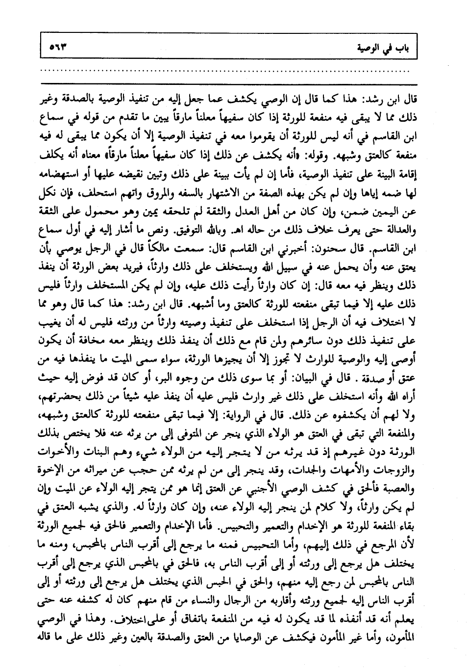 قال ابن رشد: هذا كما قال، أن الوصي يكشف عما جعل إليه من تنفيذ الوصية بالصدقة وغير ذلك مما لا يبقى فيه منفعة للورثة إذا كان سفيها معلنا مارقا يبين ما تقدم من قوله في سماع ابن القاسم في أنه ليس للورثة أن يقوموا معه في تنفيذ الوصية إلا أن يكون مما يبقى له فيه منفعة كالعتق وشبهه وقوله إنه يكشف عن ذلك إذا كان سفيها معلنا مارقا معناه أنه يكلف إقامة البينة على تنفيذ الوصية فأما إن لم يأت ببينة على ذلك وتبين نقيضه عليها أو استهضامه لها ضمه إياها، وإن لم يكن بهذه الصفة من الاشتهار بالسفه والمروق واتهم استحلف، فإن نكل عن اليمين ضمن، وإن كان من أهل العدل والثقة لم تلحقه يمين وهو محمول على الثقة والعدالة حتى يعرف خلاف ذلك من حاله ا هـ، وبالله التوفيق. ونص ما أشار إليه في أول سماع ابن القاسم قال سحنون أخبرني ابن القاسم قال سمعت مالكا قال في الرجل يوصي بأن يعتق عنه وأن يحمل عنه في سبيل الله ويستخلف على ذلك وارثا فيريد بعض الورثة أن ينفذ ذلك وينظر فيه معه قال: إن كان وارثا رأيت ذلك عليه، وإن لم يكن المستخلف وارثا فليس ذلك عليه إلا فيما تبقى منفعته للورثة كالعتق، وما أشبهه قال ابن رشد: هذا كما قال، وهو مما لا اختلاف فيه أن الرجل إذا استخلف على تنفيذ وصيته وارثا من ورثته فليس له أن يغيب على تنفيذ ذلك دون سائرهم، ولمن قام مع ذلك أن ينفذ ذلك وينظر معه مخافة أن يكون أوصى إليه، والوصية للوارث لا تجوز إلا أن يجيزها الورثة سواء سمى الميت ما ينفذها فيه من عتق أو صدقة، قال في البيان: أو بما سوى ذلك من وجوه البر أو كان قد فوض إليه حيث أراه الله، وأنه استخلف على ذلك غير وارث عليه أن ينفذ عليه شيئا من ذلك بحضرتهم ولا لهم أن يكشفوه عن ذلك، قال في الرواية: إلا فيما تبقى منفعته للورثة كالعتق وشبهه والمنفعة التي تبقى في العتق هو الولاء الذي ينجر عن المتوفى إلى من يرثه عنه فلا يختص: بذلك الورثة دون غيرهم إذ قد يرثه من لا ينجر إليه من الولاء شيء وهم البنات والأخوات والزوجات والأمهات والجدات، وقد ينجر إلى من لم يرثه ممن حجب عن ميراثه من الإخوة والعصبة فالحق في كشف الوصي الأجنبي عن العتق إنما هو ممن ينجر إليه الولاء عن الميت، وإن لم يكن وارثا ولا كلام لمن ينجر إليه الولاء عنه، وإن كان وارثا له والذي يشبه العتق في بقاء المنفعة للورثة هو الإخدام والتعمير والتحبيس، فأما الإخدام والتعمير فالحق فيه لجميع الورثة؛ لأن المرجع في ذلك إليهم وأما التحبيس فمنه ما يرجع إلى أقرب الناس بالمحبس، ومنه ما يختلف هل يرجع إلى ورثته أو إلى أقرب الناس به فالحق في بالمحبس الذي يرجع إلى أقرب الناس بالمحبس لمن رجع إليه منهم والحق في الحبس الذي يختلف هل يرجع إلى ورثته أو إلى أقرب الناس إليه لجميع ورثته وأقاربه من الرجال والنساء من قام منهم كان له كشفه عنه حتى يعلم أنه قد أنفذه لما قد يكون له فيه من المنفعة باتفاق أو على اختلاف وهذا في الوصي المأمون وأما غير المأمون فيكشف عن الوصايا من العتق والصدقة بالعين وغير ذلك على ما قاله