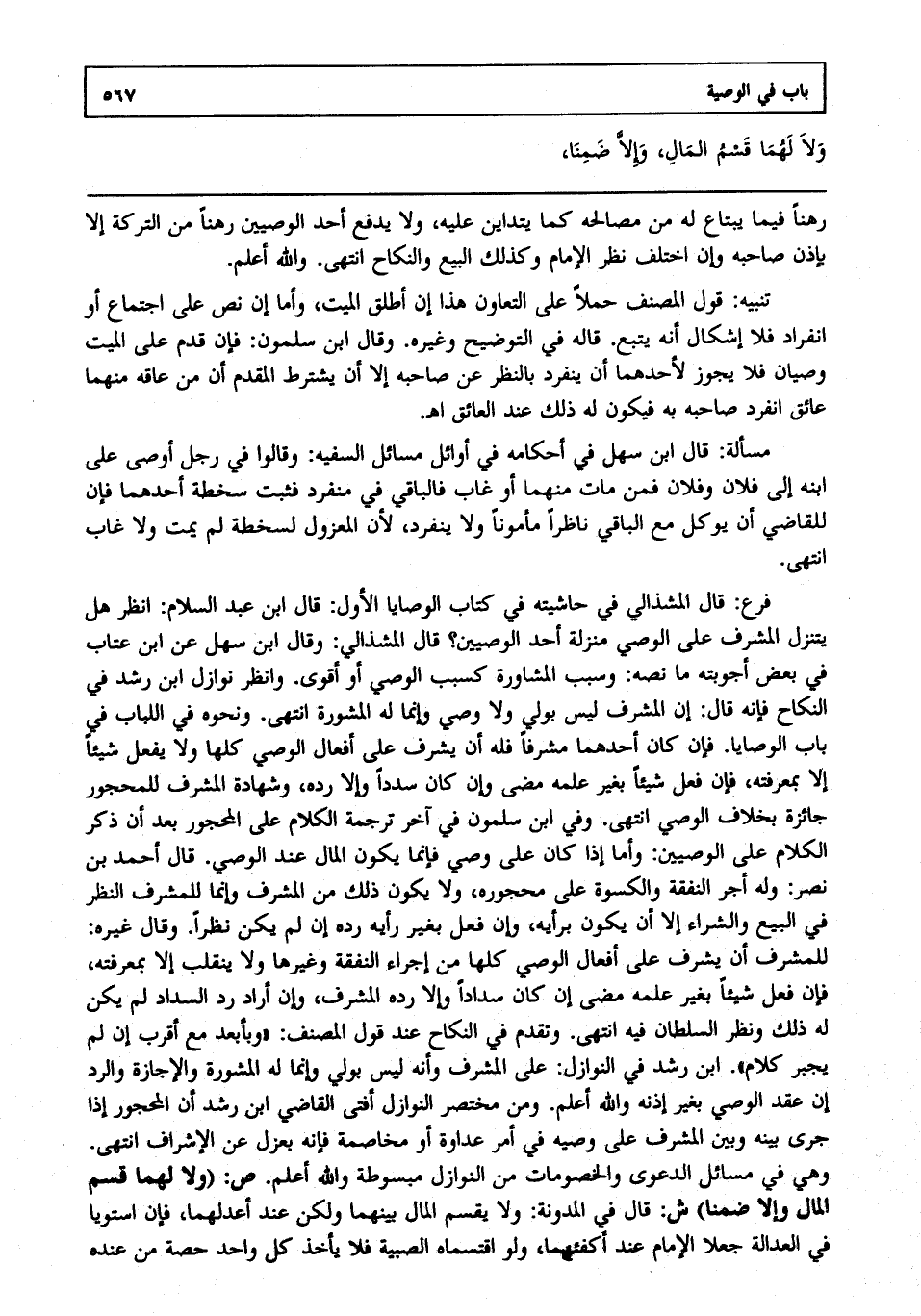 فرع: قال المشذالي في حاشيته في كتاب الوصايا الأول: قال ابن عبد السلام: انظر هل يتنزل المشرف على الوصي منزلة أحد الوصيين؟ قال المشذالي: وقال ابن سهل عن ابن عتاب في بعض أجوبته ما، نصه: وسبب المشاورة كسبب الوصي أو أقوى، وانظر نوازل ابن رشد في النكاح فإنه قال: إن المشرف ليس بولي ولا وصي، وإنما له المشورة انتهى. ونحوه في اللباب في باب الوصايا، فإن كان أحدهما مشرفا فله أن يشرف على أفعال الوصي كلها، ولا يفعل شيئا إلا بمعرفته، فإن فعل شيئا بغير علمه مضى إن كان سددا وإلا رده، وشهادة المشرف للمحجور جائزة بخلاف الوصي انتهى. وفي ابن سلمون في آخر ترجمة الكلام على المحجور بعد أن ذكر الكلام على الوصيين وأما إذا كان على وصي فإنما يكون المال عند الوصي، قال أحمد بن نصر: وله أجر النفقة والكسوة على محجوره ولا يكون ذلك من المشرف، وإنما للمشرف النظر في البيع والشراء إلا أن يكون برأيه، وإن فعل بغير رأيه رده إن لم يكن نظرا، وقال غيره: للمشرف أن يشرف على أفعال الوصي كلها من إجراء النفقة وغيرها ولا ينقلب إلا بمعرفته، فإن فعل شيئا بغير علمه مضى إن كان سدادا وإلا رده المشرف، وإن أراد رد السداد لم يكن له ذلك ونظر السلطان فيه انتهى. وتقدم في النكاح عند قول المصنف: وبأبعد مع أقرب إن لم يجبر، كلام ابن رشد في النوازل على المشرف، وأنه ليس بولي، وإنما له المشورة والإجازة والرد إن عقد الوصي بغير إذنه، والله أعلم. ومن مختصر النوازل أفتى القاضي ابن رشد: أن المحجور إذا جرى بينه وبين المشرف على وصيه في أمر عداوة أو مخاصمة فإنه يعزل عن الإشراف انتهى. وهي في مسائل الدعوى والخصومات من النوازل مبسوطة، والله أعلم. ص: (ولا لهما قسم المال وإلا ضمنا) ش: قال في المدونة: ولا يقسم المال بينهما ولكن عند أعدلهما، فإن استويا في العدالة جعله الإمام عند أكفئهما، ولو اقتسما الصبية فلا يأخذ كل واحد حصة من عنده